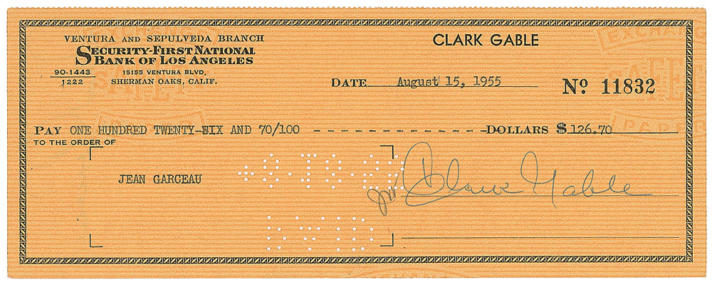 Personal check, 8.25 x 3.25, filled out in type and signed by Gable, payable to Jean Garceau for $126.70, August 15, 1955. In fine condition. Accompanied by an unsigned photo of Gable. Garceau served as the personal assistant of Carole Lombard, and then worked for both Clark and Lombard during their brief time together. Garceau remained as Gable's personal assistant following Lombard's tragic death, and published Dear Mr. G.: The Biography Of Clark Gable in 1961.