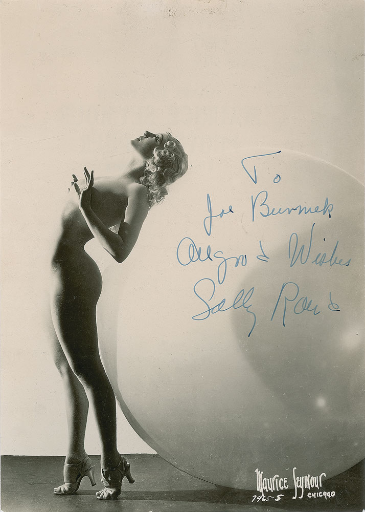 Vintage glossy 6.75 x 9.5 photo of the nude burlesque dancer by Maurice Seymour, signed and inscribed in fountain pen, "To Joe Burnick, All good wishes, Sally Rand.” Reverse bears a Maurice Seymour credit stamp. In fine condition, with tastefully trimmed edges and a PSA/DNA label affixed to the reverse. Accompanied by a certificate of authenticity from PSA/DNA.