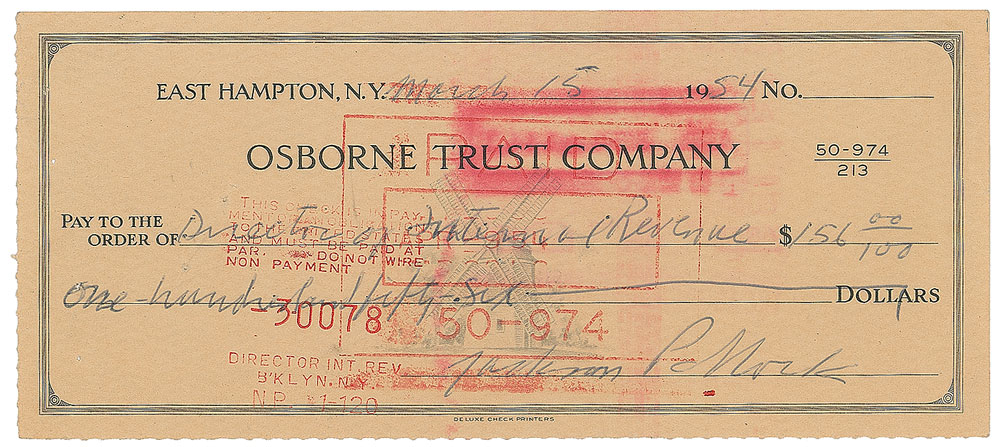 Excessively rare Osborne Trust Company check, 6.25 x 7.25, filled out and signed by Pollock, "Jackson Pollock," payable to Director of Internal Revenue for $156, March 15, 1954. In fine condition. Shortly after abandoning his influential 'drip and splash' style of painting, Pollock entered his last great phase of productivity with the 'black pourings.' Created between 1951 and 1953, the colorless works presented stark and abstract depictions of Pollock's struggles with depression and alcoholism; their bleakness ultimately earned mixed fanfare and poor gallery sales. With his profits gravely low, Pollock relented to color and created a handful of new paintings before giving up the medium and turning to sculpture in the years prior to his death. In consideration of dealer commissions and his own work and living costs, a financially unstable Pollock received meager income tax bills, with this small check to the IRS indicative of such problems. Of tremendous rarity, Pollock's autograph is immensely desirable and represents the height of 20th century American art.