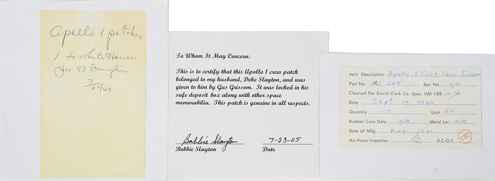 Highly desirable embroidered Apollo 1 mission patch deriving from the personal collection of original Mercury astronaut Deke Slayton. The patch measures 3.5″ in diameter and includes a signed letter of provenance from Bobbie Slayton dated July 23, 2005, in full: "This is to certify that this Apollo 1 crew patch belonged to my husband, Deke Slayton, and was given to him by Gus Grissom. It was locked in his safe deposit box along with other space memorabilia. This patch was is genuine in all respects." In fine condition. From one Mercury astronaut to another, this is a highly coveted original Apollo 1 mission patch—examples of such were only distributed to the crew and a few NASA workers. From the collection of aerospace memorabilia specialist Ken Havekotte.