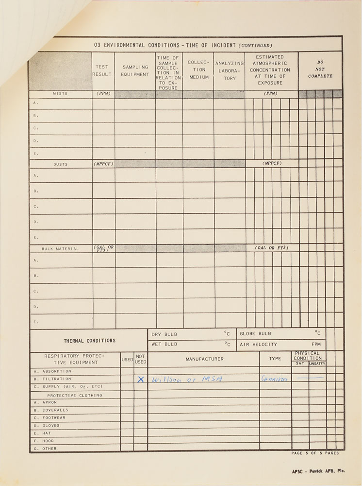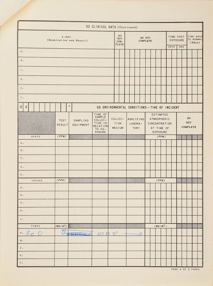 Very rare "Report of Toxicological Exposure" issued to James D. Gleaves, a North American Aviation mechanical technician present during the Apollo 1 tragedy. The report, five pages, 8 x 10.5, lists various information related to Gleaves and the accident, including: Date of Exposure ("27 Jan 67"), Organizational Address ("North American Aviat. Cocoa Beach, Fla"), Age ("34"), Operational Occupation ("Space Veh. Test. Mech."), Agents Involved ("Berylium, potential"), Exposure Duration ("15" minutes), Route of Body Entry ("Inhalation"), and Primary Body System Affected ("Lungs"). Lower portion features a handwritten description of incident: "Cx 34 Apollo fire 1/27/67. Subject was in capsule area approx. 10-15 minutes after start of fire attempting to assist in rescue. Retreated periodically for fresh air. Use of Perspiratory equipment minimal. Claimed equipment would not allow passage of air." The succeeding four pages concerning "Clinical Data" and "Environmental Conditions" include only the mention of fumes as "BeO" and the lack of used filtration. In fine condition. Gleaves was one of three North American employees present at the fire, which also included Pad Leader Donald O. Babbitt and Systems Technician L. D. Reece. Moments after the first distress call was heard, a concussive flash of flame sent the men reeling, but only to return seconds later, battling against smoke and fire in an attempt to release the trapped astronauts. More and more men joined the effort, each one leaving intermittently to gasp for fresh air. When the fire was finally extinguished, the bodies of the Apollo 1 crew were recovered some fifteen minutes after the initial outcry of fire. A rare and entirely poignant official document relating to the tragic genesis of the Apollo program. From the collection of aerospace memorabilia specialist Ken Havekotte.