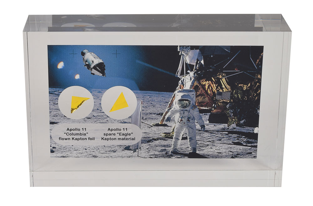 Acrylic display featuring two small triangular swatches of Kapton foil, one flown on the Command Module 'Columbia' and one swatch removed from the Lunar Module 'Eagle' prior to flight. The acrylic block measures 5 x 3.25 x 1. In fine condition. Accompanied by a certificate of authenticity from Florian Noller of spaceflori.com, along with documentation describing the provenance of the swatches.