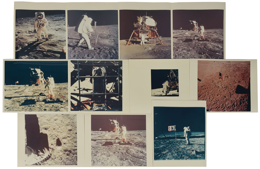 Collection of eleven original vintage color glossy photos of Apollo 11, 8 x 10 and 10 x 8, showing various aspects of the mission's extra-vehicular activities, including the famous 'man on the moon' shot of Buzz Aldrin on the lunar surface. All bear “A Kodak Paper” watermarks on the reverse. In fine condition.