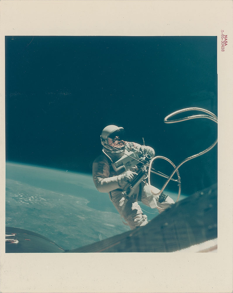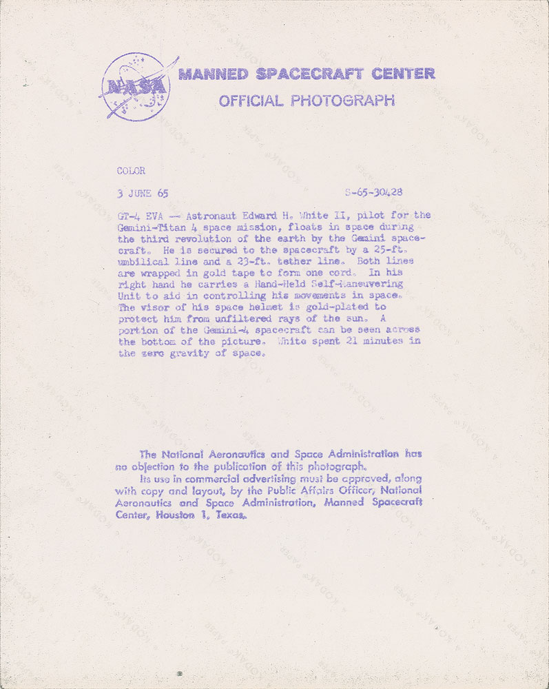 Original vintage color glossy 8 x 10 red-numbered NASA photo portraying Edward H. White III during his historic Gemini 4 spacewalk—the first ever conducted by an American astronaut. Reverse bears purple NASA caption text and "A Kodak Paper" watermarks. In fine condition, with a couple of minor creases.