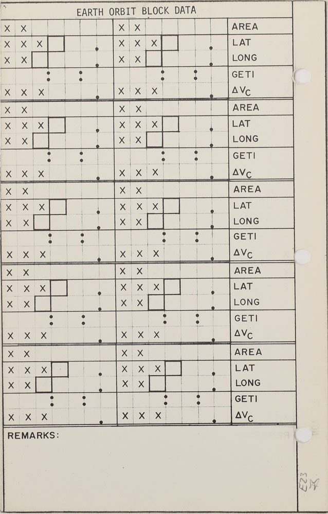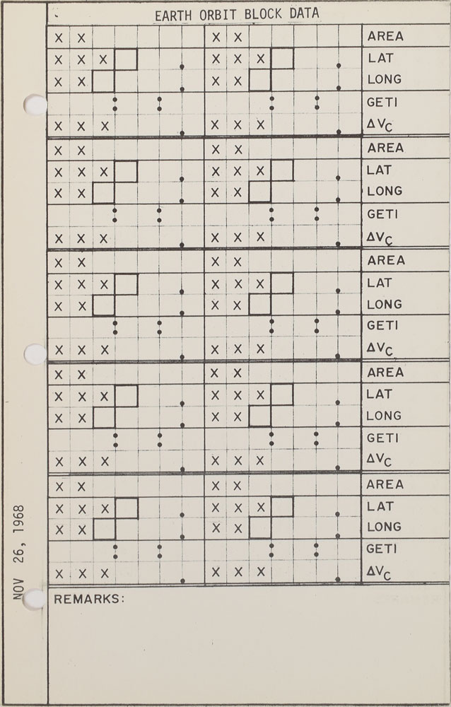 Flown double-sided checklist page headed "Earth Orbit Block Data," 5 x 8, removed from Jim Lovell's flown Apollo 8 "Updates" book, part number SKB32100042-201, serial number 1003. The page is dated November 26, 1968, along the left edge. In fine condition. Accompanied by a certificate of authenticity from Florian Noller of spaceflori.com, stating that this was removed from Lovell's flown "Updates" book.
