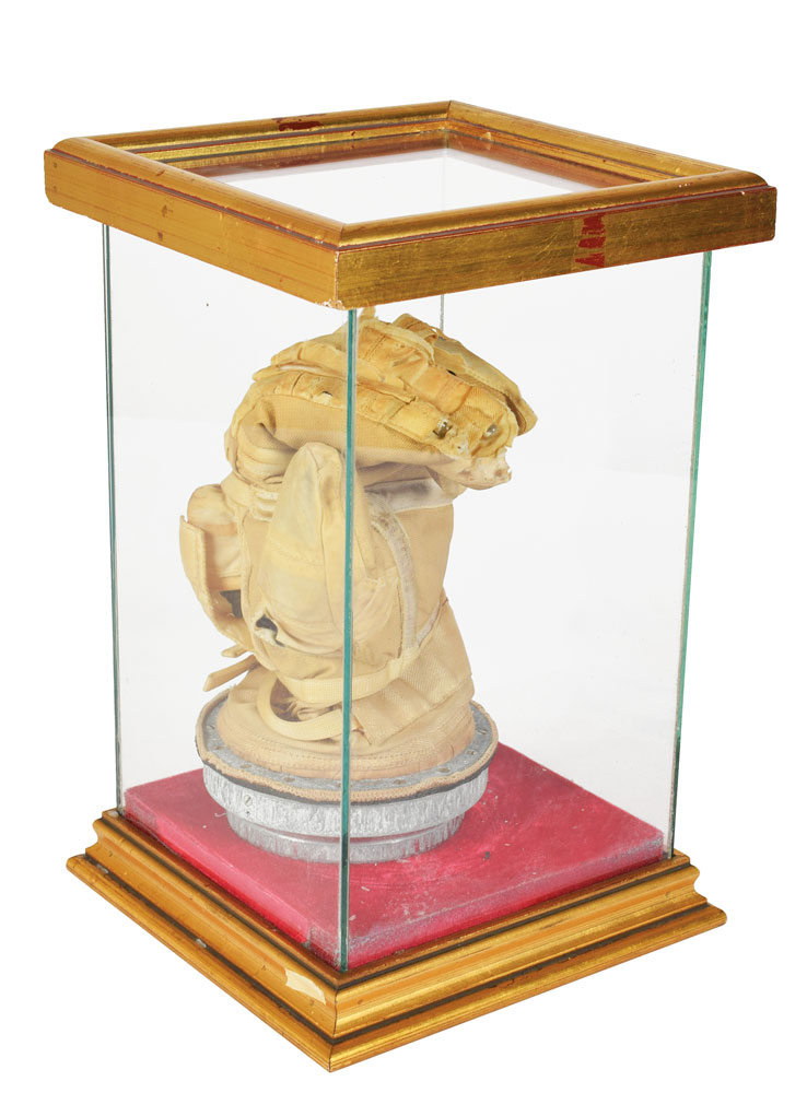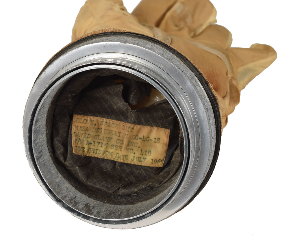Gus Grissom’s personally-used Gemini G-4C training glove, presumably affiliated with his role as the backup Command Pilot for the Gemini 6 mission. Consisting of a neoprene liner cover and a few layers of nonporous cloth, the glove is specialized for Grissom, and bears an identification label sewn into the back wrist section: “Glove, Space Suit, NASA Designation GG-4C-18, David Clark Co. Inc., P/N A-1715 Ser No. 418, Size Grissom Date July 1965.” The glove attaches to the suit via an anodized aluminum wrist ring, features exterior adjustable restraints, and is equipped with small flashlights on the index and middle fingers, which are connected to a battery pack. Housed in a glass display case. In very good condition, with overall toning and considerable wear to fingers; interior lining is quite fragile. From the personal collection of Charlie Dry, a former Apollo test astronaut and research engineer and senior scientific analyst at NASA, who includes a brief letter of provenance: “The training glove was given to me by Astronaut Gus Grissom during a training mission…We were leaving the NASA-JSC suit room in the Crew Systems building, and I said, ‘Gus, I have no souvenir.’ Gus said, ‘Take this glove.’ Wow!“