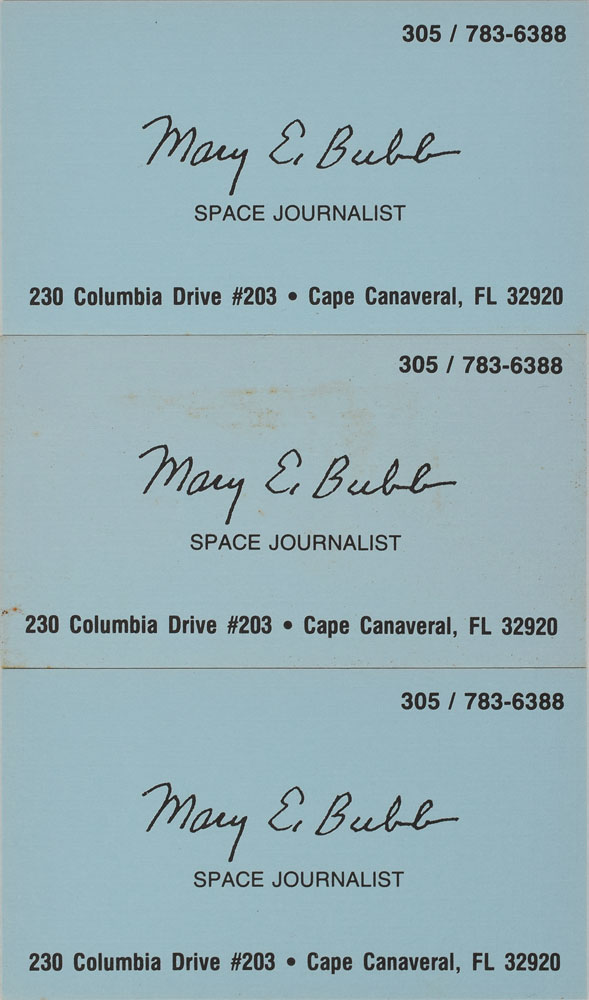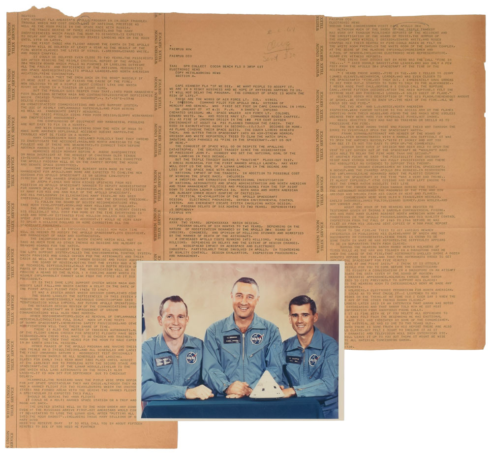 Group of three Western Union telegrams relating to the Apollo 1 tragedy on January 27, 1967, each one page, ranging in size from 8.5 x 13.5 to 8.5 x 21.5, including: a telegram from Reuters, in part: "Cape Kennedy FLA America's Apollo program i[s] in deep trouble; trouble which may cost great loss of national prestige as well as the moon prize in the space race with Russia. The tragic deaths of three astronauts, and the many inefficiencies which paved the road to disaster, is expected to delay any hope of the United States landing men on the moon until 1970 or later"; a second, headed "Fairpub CCO…Cocoa Beach FLO 2 305P EST…Copy Metalworking News, Section A," in part: "Cape Kennedy FLA 'If we die, we want people to accept it. We are in a risky business and we hope if anything happens to us, it will not delay the program. The conquest of space is worth the risk of life. ' These are the words of Air Force Lt. Col. Virgil I. Grissom, Command Pilot for Apollo 204, veteran of Mercury and Gemini, who first set foot on Cape Canaveral in 1959. On January 27 at 6:31 P.m. a Dante's Inferno cremated Grissom, 40, space walker Air Force Lt. Colonel Edward White, 36, and rookie Navy Lt. Commander Roger Chaffee, 31"; and the third, headed "Fairpub CCO, Electronic News, Second take Congressman visit Cape Apollo 204," in part: "Although much of the shock of the triple tragedy has worn off through published reports of the accident and the investigation of the board of reviews, the horror of the moment when Virgil I. Grissom, Edward White, and Roger Chaffee met their deaths by fire could again be felt in the White Room Friday." Includes an official color semi-glossy 10 x 8 photo of the Apollo 1 crew, with "A Kodak Paper" watermarks on the reverse. In overall very good to fine condition, with toning, trimming, and a tear to right side of one. Accompanied by business cards from noted space journalist Mary E. Bubb. From the collection of aerospace memorabilia specialist Ken Havekotte.