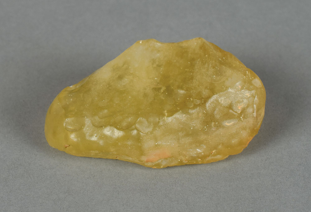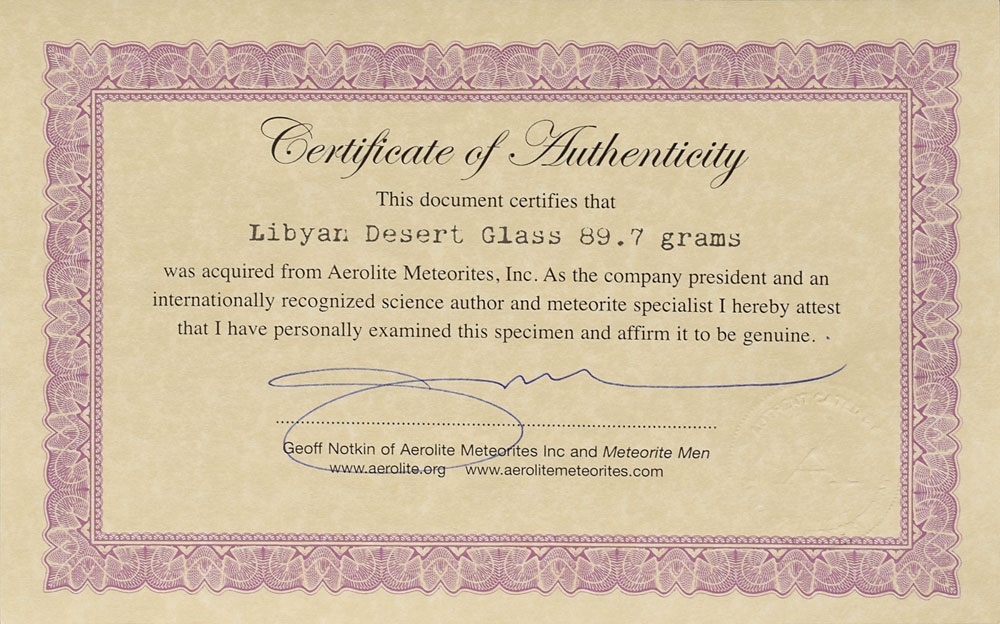 A piece of Libyan Desert Glass (Egypt) impactite. The complete individual specimen weighs 89.7 grams and measures approximately 70 mm x 45 mm x 30 mm. This exquisite honey-colored translucent natural glass was formed by the heat and pressure of an ancient meteorite impact millions of years ago. Accompanied by a certificate of authenticity signed by Geoff Notkin of Aerolite Meteorites Inc. and the TV show Meteorite Men. Libyan Desert Glass is now extremely difficult to obtain, as removing material from the site is prohibited by the Egyptian government; this material was obtained prior to the ban. The scarab beetle of Tutankhamun's pectoral pendant was carved from Libyan Desert Glass, giving this striking meteoritic material a unique link to Egypt and to humanity's distant past. Noted expert and "Meteorite Man" Geoff Notkin educates us on his adventures worldwide as a meteorite hunter in this podcast.