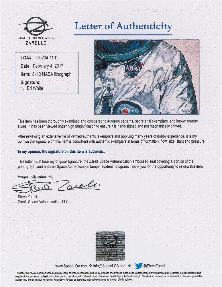 Official color 8 x 10 NASA lithograph of White posing in his Gemini space suit, signed in black felt tip, "Ed White." In fine condition. Accompanied by a full letter of authenticity from Zarelli Space Authentication.