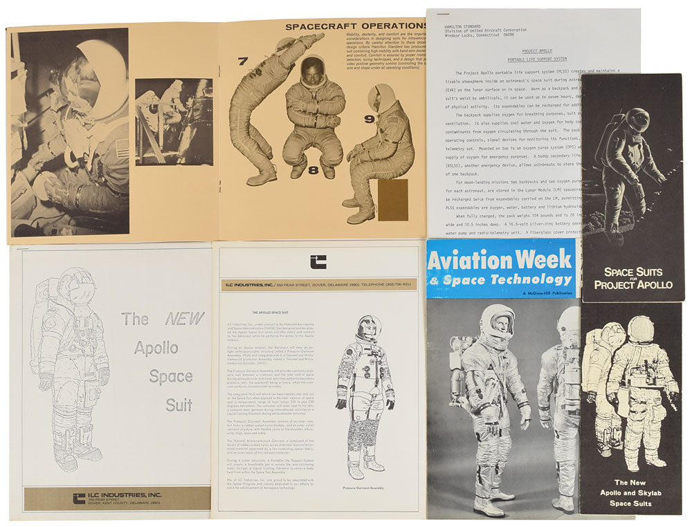 Assortment of vintage publications relating to the development of the Apollo and Skylab space suits, including: a Hamilton Standard booklet entitled "Mobility," consisting of a visual breakdown of their dynamic new space suit; a pair of ILC Industries brochures, one entitled "Space Suits for Project Apollo," the other "The New Apollo and Skylab Space Suits"; an ILS Industries packet for "The New Apollo Space Suit," which features a pair of detailed suit illustrations; an ILC Industries information sheet for the "Apollo Space Suit," showing an illustration of the "Pressure Garment Assembly"; a 15-page packet from Hamilton Standard for "Project Apollo, Portable Life Support System," which offers an informative rundown of its properties and equipment; and an Aviation Week & Space Technology newsletter, with a special report for "Apollo Spacesuit Design Program." In overall very good to fine condition. From the collection of Dan Schaiewitz, who worked as Extravehicular Crew Training Engineer at KSC. View Dan's many Collect Space posts here. Engineer Dan Schaiewitz gives us a fascinating firsthand glimpse into his experiences on the cutting edge of space exploration during the Apollo missions, in this podcast.