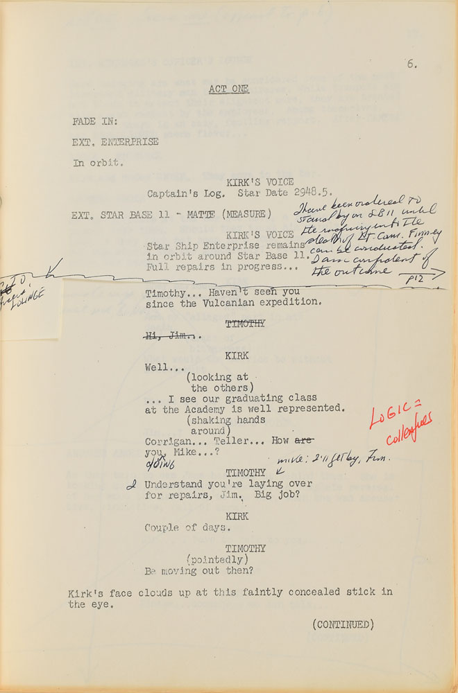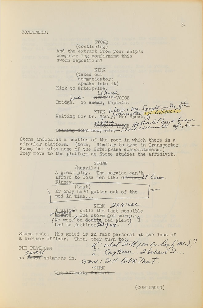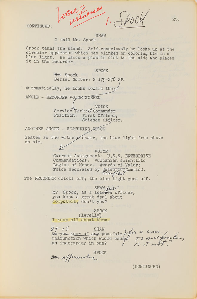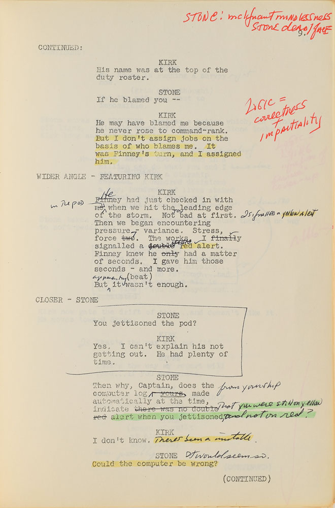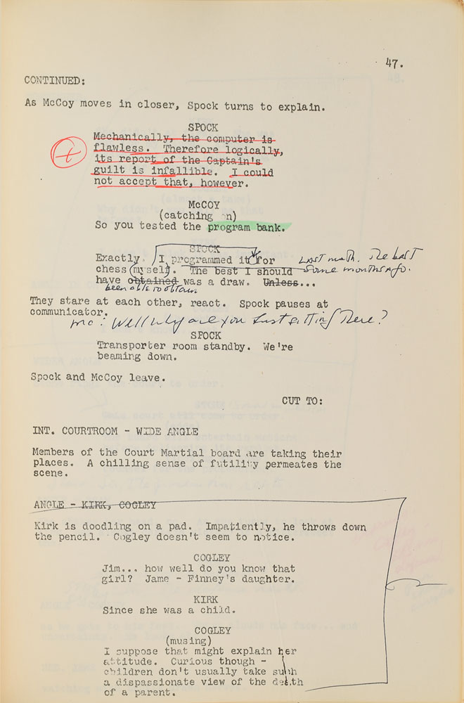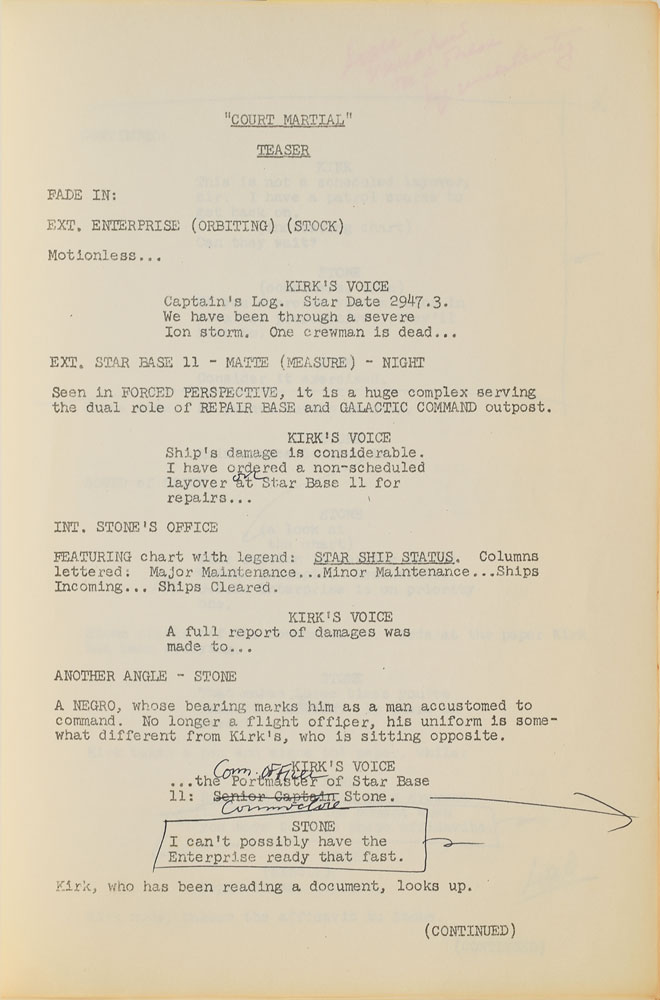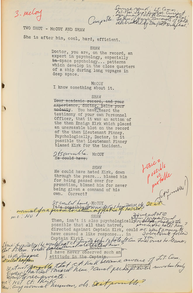 Remarkable production-used, heavily annotated script for the twentieth Star Trek episode of the first season, entitled "Court Martial," 8.5 x 11, 69 pages, with the front cover reading: "Star Trek, 'Court Martial,' Teleplay by: Don M. Mankiewicz and Steven Carabatsos, Story by: Don M. Mankiewicz, Final Draft, Sept. 26, 1966." The script bears numerous handwritten notations on every page, most in red or black ink, with some passages highlighted; these annotations rewrite portions of the dialogue, make notes, and change elements of the script. They were presumably made by Mankiewicz and Carabatsos during their edits of the script. In fine condition, with an ownership blindstamp to the cover sheet.