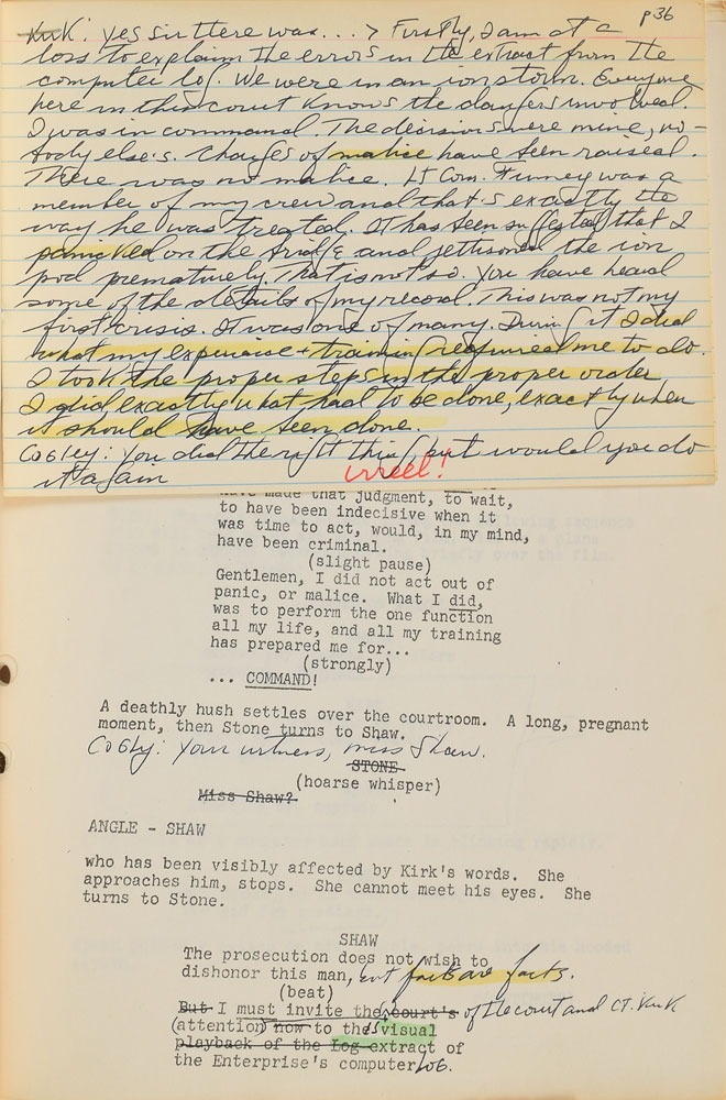 The episode, in which Captain Kirk stands trial on charges of negligence, was originally conceived by Mankiewicz when producer Gene L. Coon came to him with a proposal to write a compelling dramatic story that used a simple, easily constructed set. Mankiewicz responded with an original script entitled 'Court-martial on Starbase Eleven.' Coon determined that the script had to be entirely rewritten, and with Mankiewicz unavailable, gave the job to recently hired story editor Steve Carabatsos, directing him to use the same ideas and the same sets. This extraordinary annotated script seems to stem from this round of re-writes.