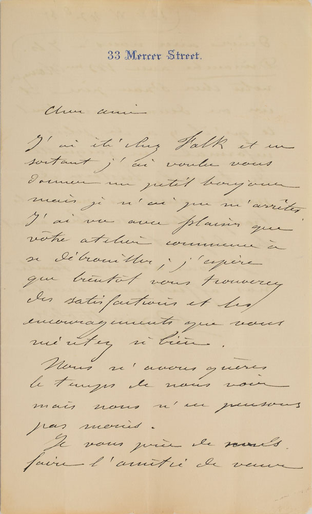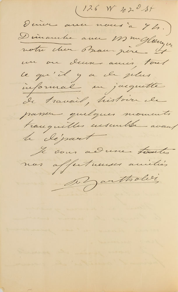 ALS in French, signed “Bartholdi,” one page both sides, 5 x 8, 33 Mercer Street letterhead, no date but likely circa 1886. Letter to friend and fellow Statue of Liberty collaborator Georges Glaenzer, in part (translated): "I was at Falk's and when I left I wanted to say hello to you, but I was not able to stop. I was pleased to see your studio beginning to catch on; I hope that you will find the satisfactions and encouragements you so richly deserve…I beg you to show us the friendship of coming to dine with us at 7 pm Sunday (at 126 W 42nd St.) with Mrs. Glaenzer, your dear father-in-law and one or two friends, all of it informal, in working clothes [so that we can] spend a few tranquil moments together before departure." In fine condition. The "33 Mercer Street" letterhead signifies the Franco-American Union's New York headquarters; the Franco-American Union was formed to raise the funds for the project officially known as 'Liberty Enlightening the World,' commonly known as the Statue of Liberty. On October 28, 1886, Bartholdi and Glaezner, along with President Grover Cleveland and other dignitaries, attended the inauguration ceremonies of the Statue of Liberty. The monumental sculpture had taken over twenty years to conceive, design, construct, transport, and assemble. Georges Glaezner was one of the people who made it possible, as secretary of the French commission charged with fundraising for the statue. His father-in-law, Richard Butler, was a rubber manufacturing magnate who served as an officer on the Franco-American Union fundraising committee. Bartholdi's passing reference to the studio of New York celebrity photographer Benjamin Falk suggests that the publicity-minded sculptor may have had his picture taken there to commemorate his last American trip.
