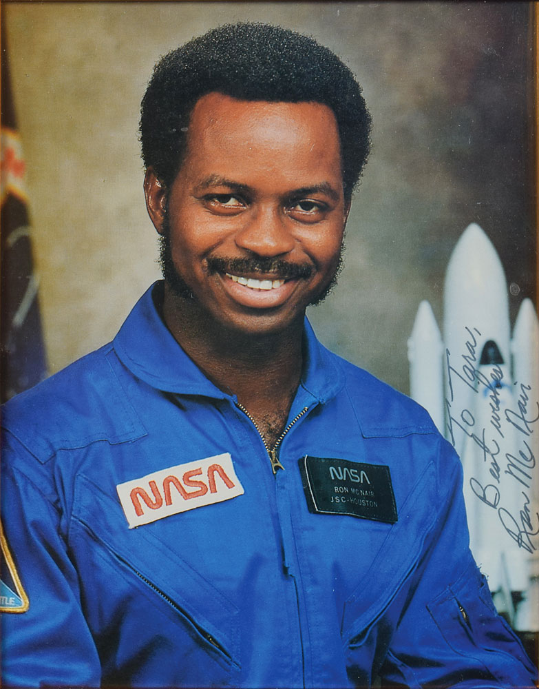 Color semi-glossy 7.25 x 9.25 photo of McNair posing in his blue flight suit, vertically signed and inscribed in black felt tip, "To Tara, Best wishes, Ron McNair.” Matted and framed with a pair of engraved information plaques, both relating to the Space Shuttle Challenger, to an overall size of 22 x 22. In fine condition.