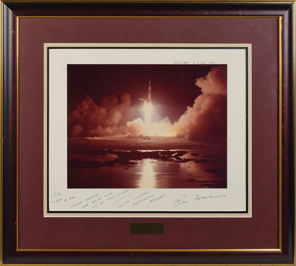 Awesome color semi-glossy 14 x 10.75 photo of the launch of the Apollo 17 mission, signed and inscribed on the mount in black ink, "To Myra & Ray, Many thanks for being with us on the flight, with sincere personal regards, Ron Evans,” who adds above the photo, "Apollo XVII 6-19 Dec 1972." Triple-matted and framed with an engraved plate to an overall size of 25.5 x 23. In fine condition.