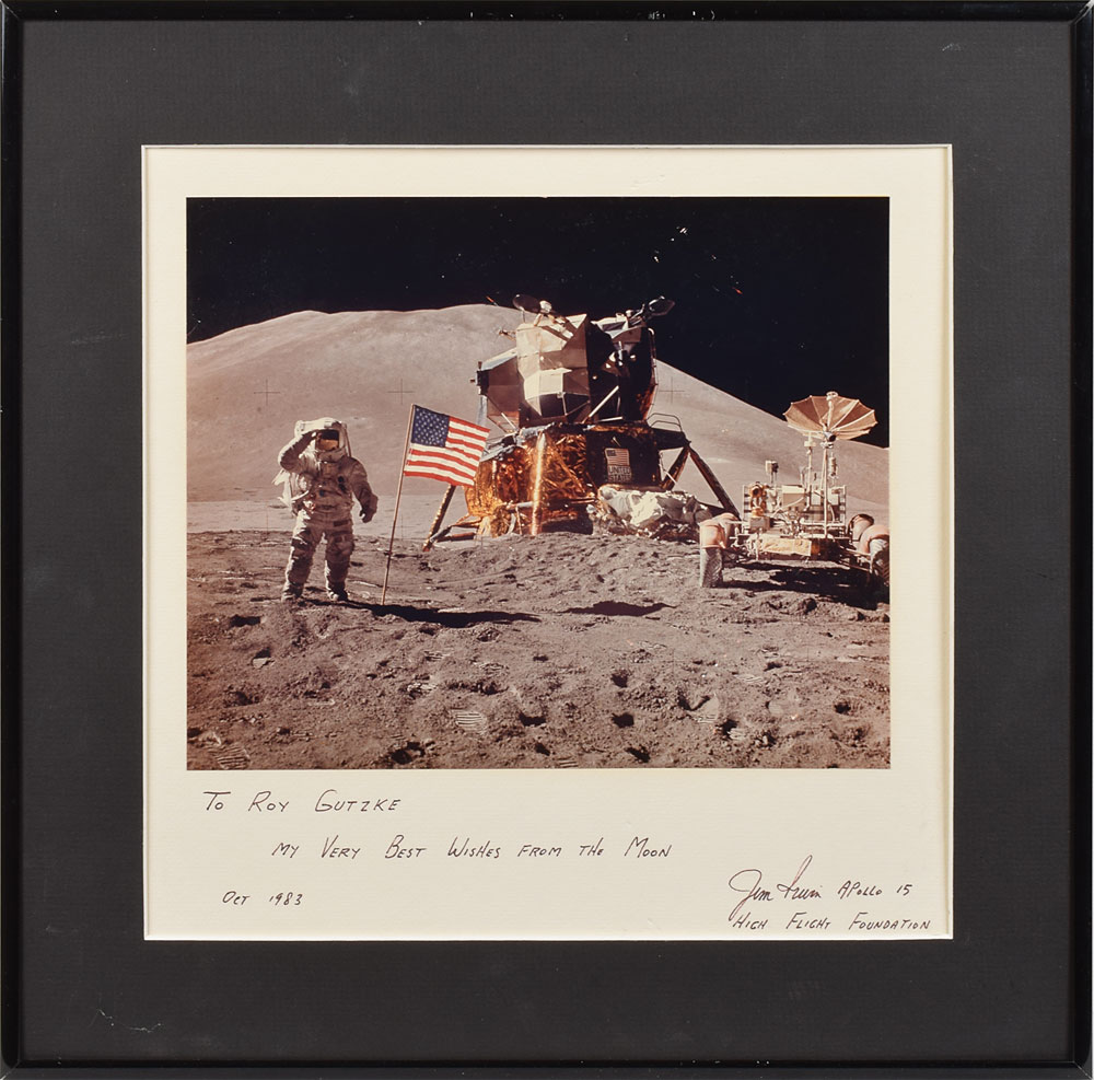 Color semi-glossy 9.75 x 8 full-length photo of LMP Irwin saluting the American flag on the lunar surface, signed and inscribed on the mount in black ink, "To Roy Gutzke, My very best wishes from the Moon, Jim Irwin Apollo 15, High Flight Foundation, Oct 1983.” Matted and framed without glass to an overall size of 15.25 x 15. In very good condition, with some creasing and spotting to the image, and a light crease and a few small gouges to the mount.