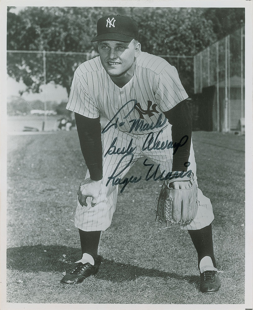 Glossy 8 x 10 photo of Maris in his Yankee pinstripes, signed and inscribed in black felt tip, "To Mark, Best Always, Roger Maris.” In fine condition, with a few small surface impressions.
