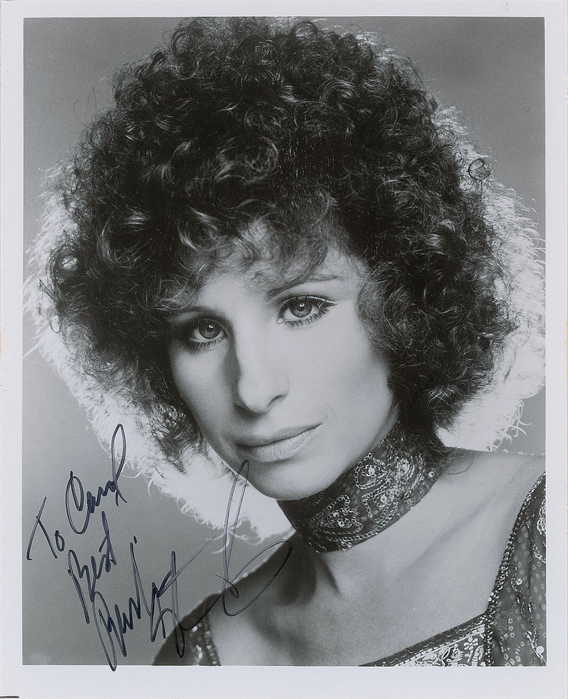 Attractive glossy 8 x 10 close-up photo of the curly haired entertainer, signed and inscribed in black felt tip, "To Carol, Best, Barbra Streisand.” In very good to fine condition, with light overall creasing.