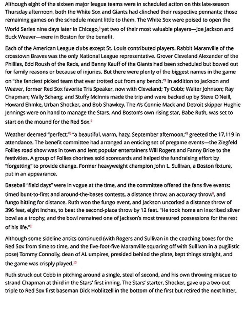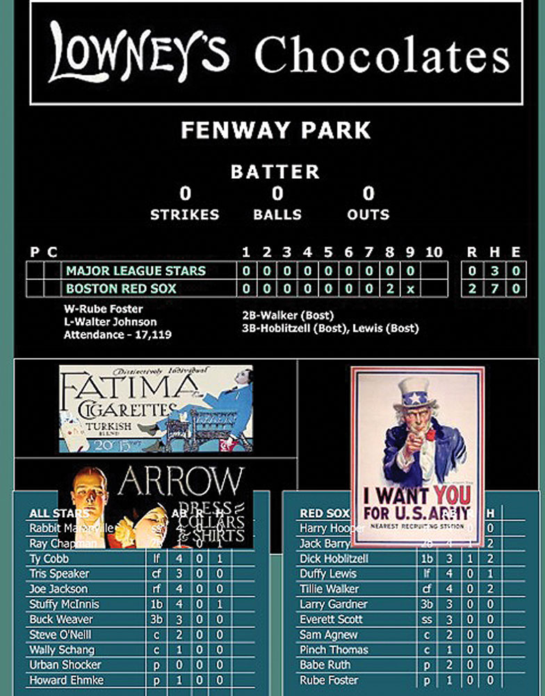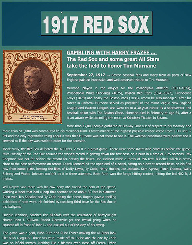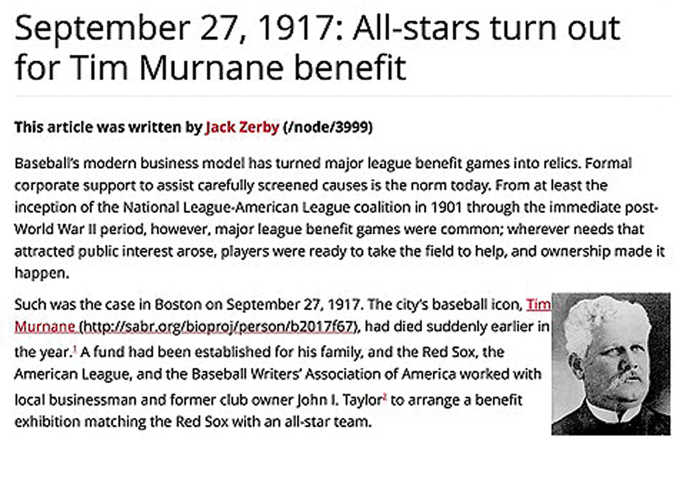 Murnane, a former professional ballplayer himself, was one of the few player-friendly voices in the baseball media and a treasured ‘prince’ among journalists.The fundraiser was arranged by former Red Sox owner John I. Taylor, the American League, and the Baseball Writers’ Association of America. Despite there being four regular season American League games scheduled that day—including one between Walter Johnson’s Washington Senators and Joe Jackson’s Chicago White Sox—the pennants were locked up, and teams granted their star players leave to converge on Fenway Park from around the country.