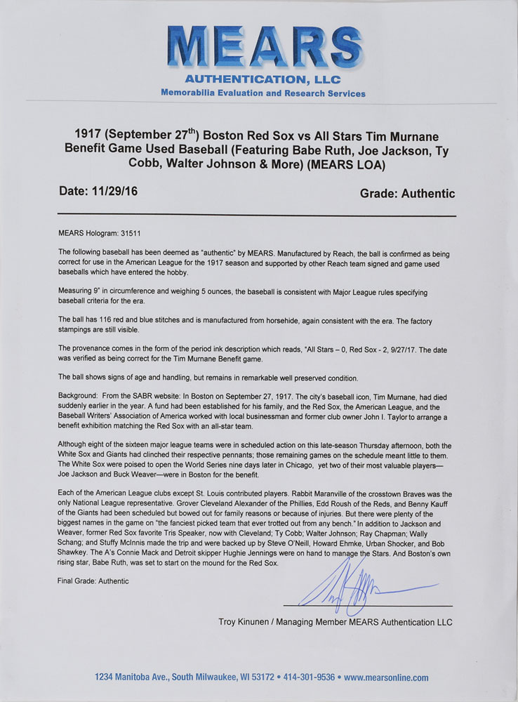 This amazing baseball, which tells the story of the Tim Murnane Day benefit game in a ‘thousand words’ through its game use, is an official horsehide American League baseball manufactured by Reach, featuring 116 red-and-blue stitches, with most stampings still visible. Baseballs were considered very expensive in 1917 and when foul balls were hit into the stands, fans threw them back onto the field to be re-used. The provenance for this ball comes in what was the customary form back in the day—a period ink inscription across the sweet spot: “9 /27/17, All Stars—0, Red Sox—2.” It exhibits heavy wear commensurate with use in the game, and a small puncture near the inscription, likely caused by the method of display by the original owner. Accompanied by a full letter of authenticity from Mears.