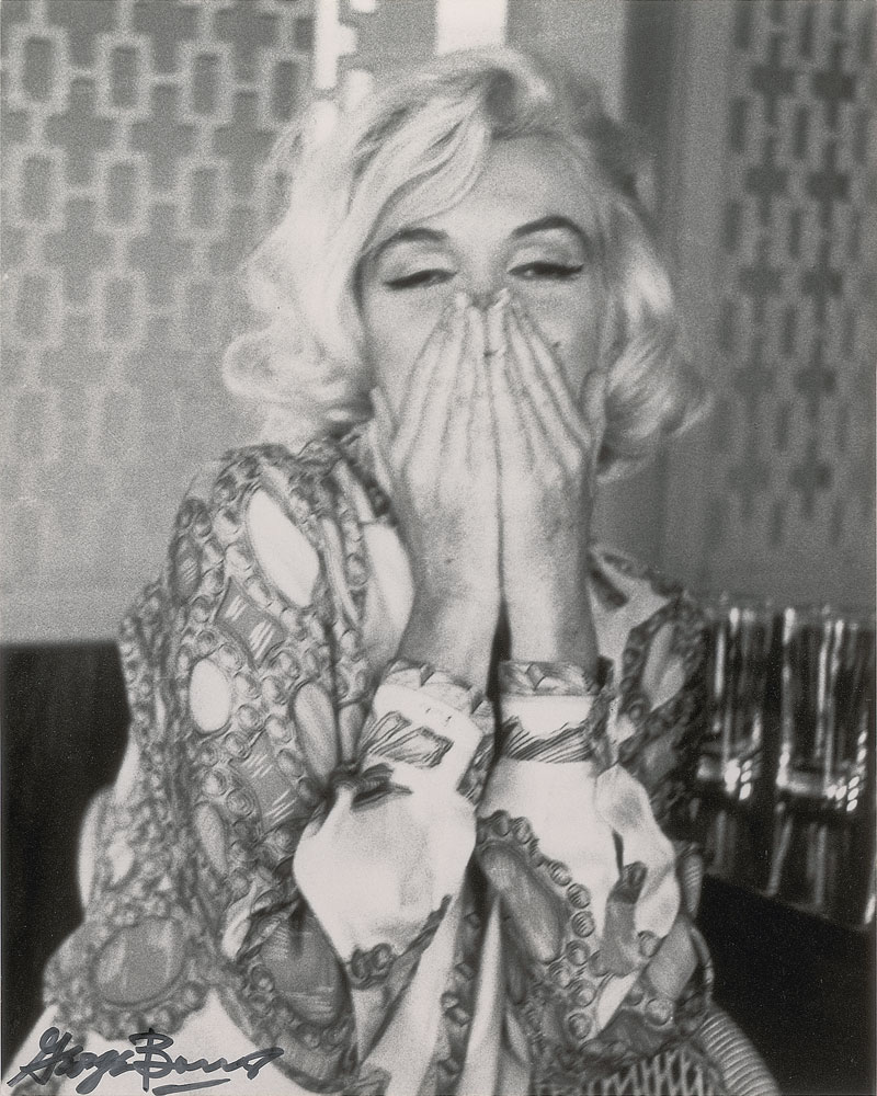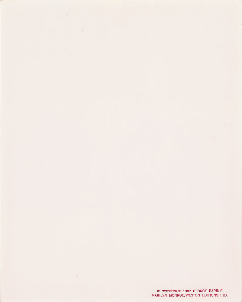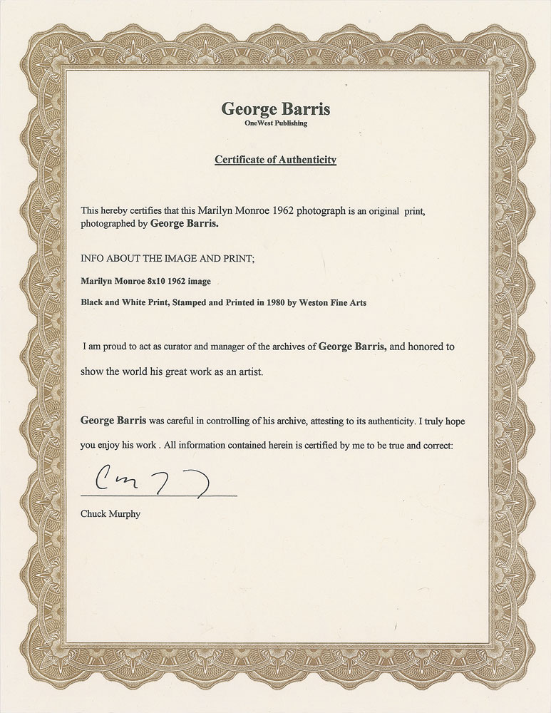Satin-finish 8 x 10 print of Marilyn Monroe with her hands over her mouth taken by George Barris during Monroe's final photo shoot in 1962 and printed in the 1980s, signed in the lower left in black felt tip by Barris. Reverse bears a 1987 George Barris/Marilyn Monroe/Weston Editions copyright stamp. In very fine condition. Accompanied by a certificate of authenticity from OneWest Publishing.