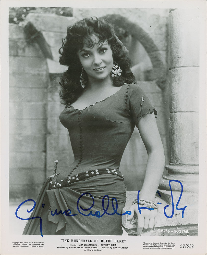 Glossy 8 x 10 Allied Artists publicity photo of Lollobrigida as Esmeralda from the 1956 film The Hunchback of Notre Dame, signed in blue felt tip. In fine condition. From the Harvey and Rhoda Kuflik Collection.