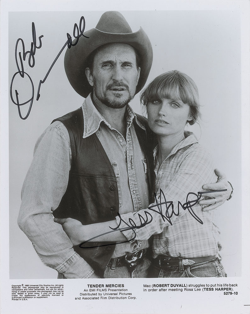 Glossy 8 x 10 Universal Pictures publicity photo of Robert Duvall as Mac Sledge and Tess Harper as Rosa Lee from the 1983 film Tender Mercies, signed by both in black felt tip. In fine condition. For his performance as an aging country singer, Duvall won the Academy Award for Best Actor. From the Harvey and Rhoda Kuflik Collection.