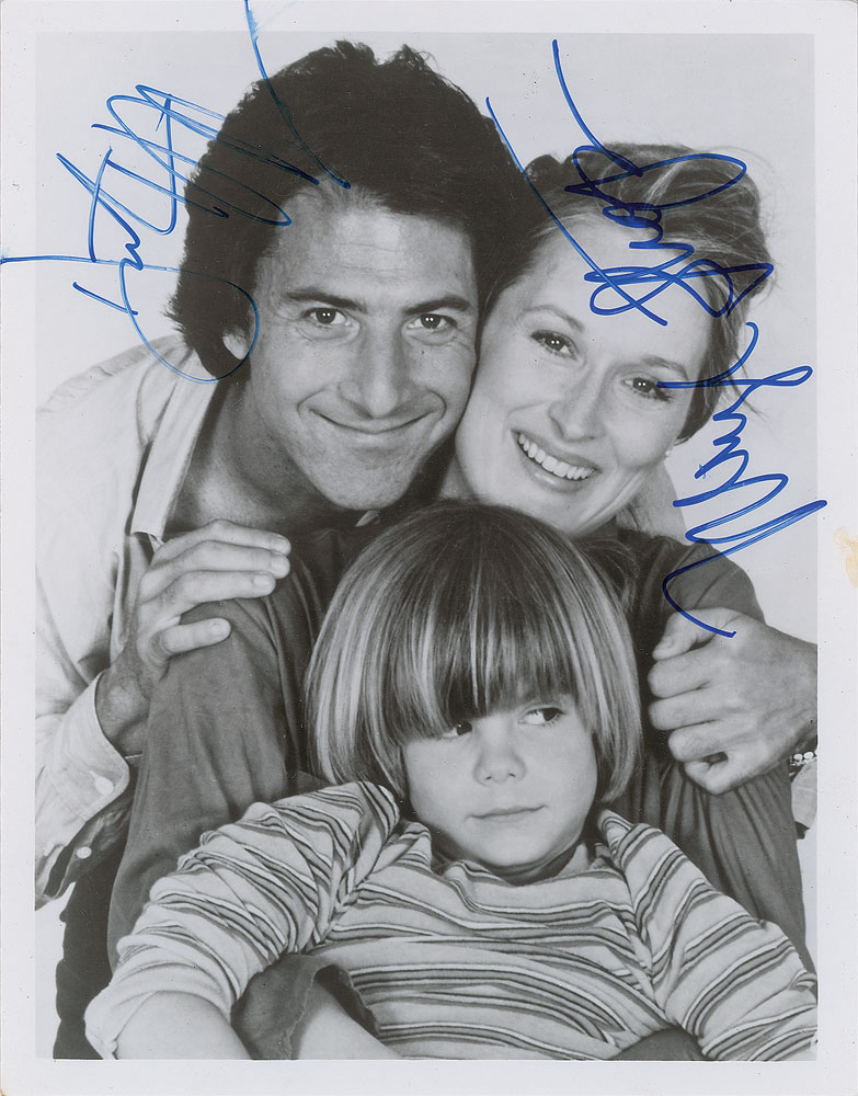 Glossy 7 x 9 publicity photo of Ted and Joanna Kramer with their son Billy from the 1979 film Kramer vs. Kramer, signed in blue felt tip by Dustin Hoffman and Meryl Streep. In fine condition, with a small stain in the right border. Both Streep and Hoffman earned their very first Oscars for their performances. From the Harvey and Rhoda Kuflik Collection.