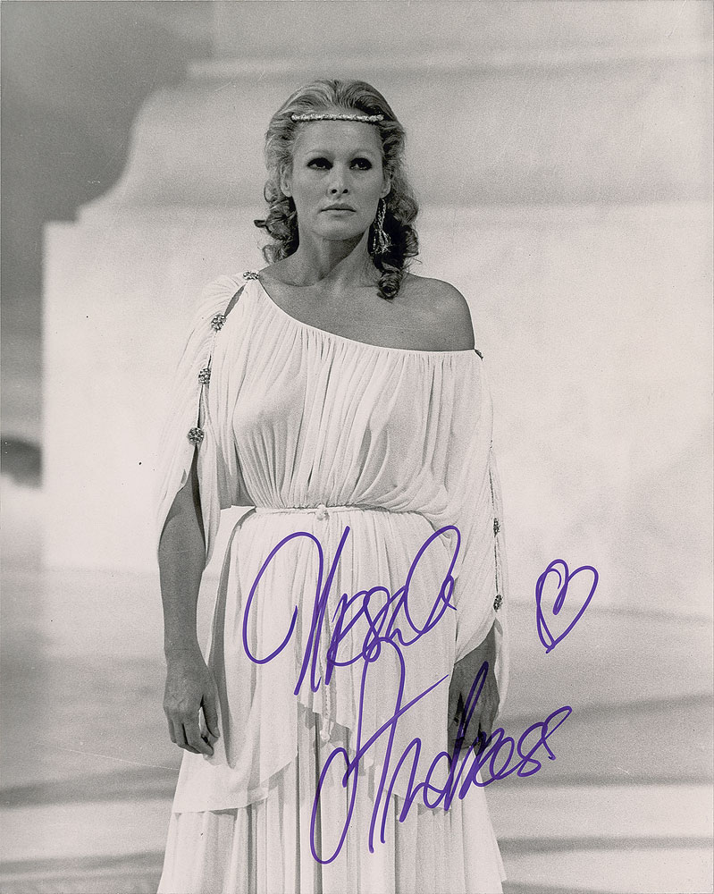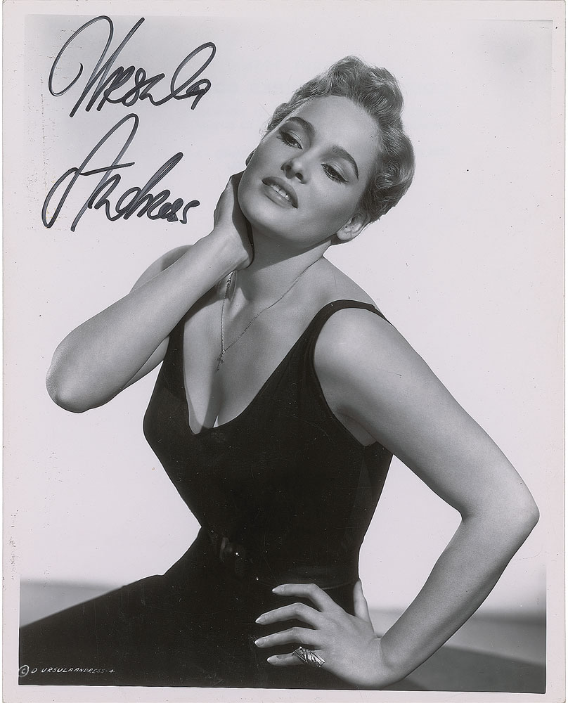 Two glossy 8 x 10 photos: a Columbia Pictures publicity photo of Andress wearing a sleek black dress, signed in black felt tip; and a photo of Andress as Aphrodite from the 1982 film Clash of the Titans, signed in purple felt tip and adding a heart. Reverse of publicity photo bears a Coburn photography credit stamp. In overall fine condition. From the Harvey and Rhoda Kuflik Collection.