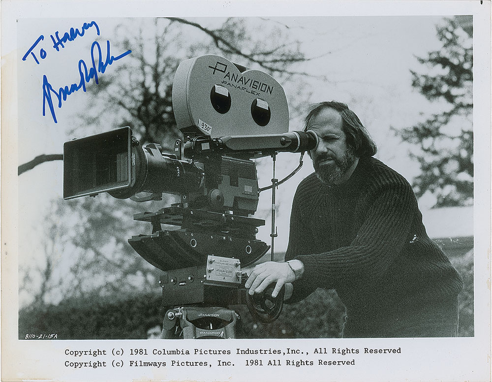 Glossy 10.25 x 8 Filmways Pictures publicity photo of De Palma behind the camera during production of the 1981 film Blow Out, signed and inscribed in blue felt tip, "To Harvey, Brian De Palma.” In fine condition. From the Harvey and Rhoda Kuflik Collection.