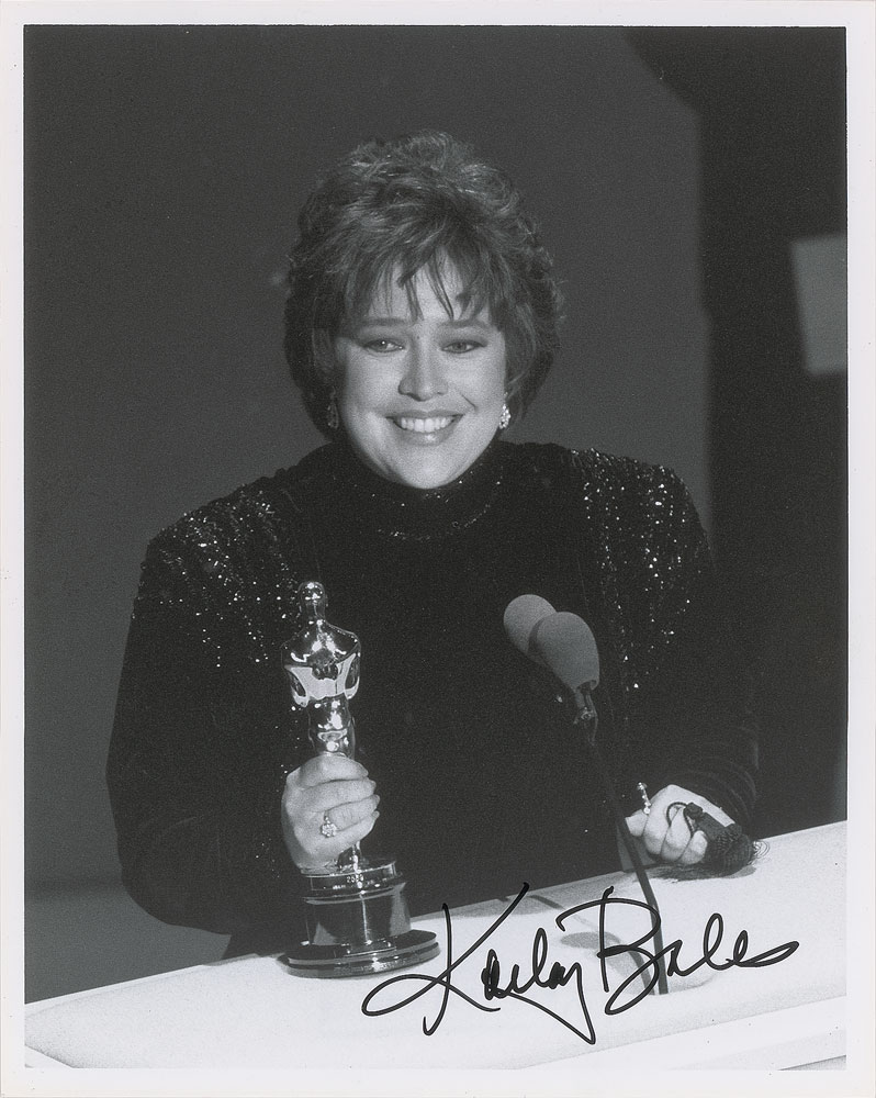 Glossy 8 x 10 photo of Bates after winning the Best Actress Oscar for her role as Annie Wilkes in the 1990 film Misery, signed in black felt tip. Reverse bears an AMPAS copyright stamp. In very fine condition. From the Harvey and Rhoda Kuflik Collection.