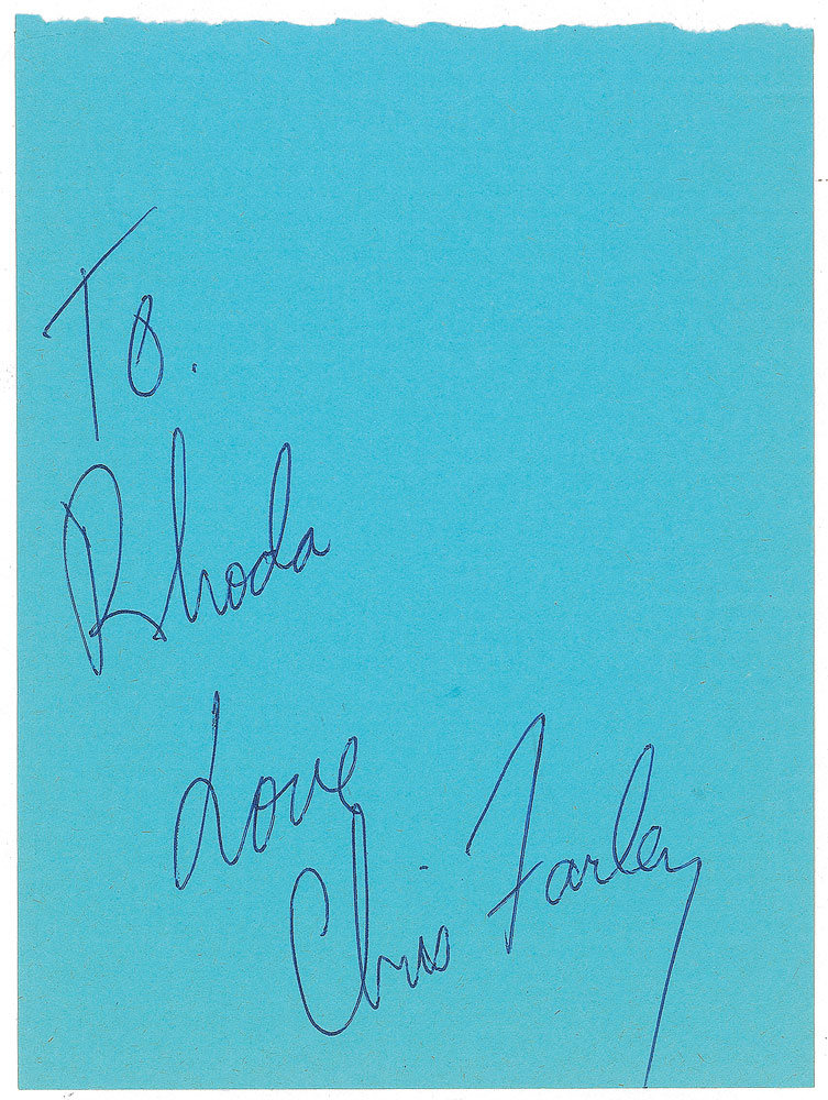Ballpoint signature and inscription, "To Rhoda, Love, Chris Farley,” on a blue 4.5 x 6 sheet. In fine condition. From the Harvey and Rhoda Kuflik Collection.