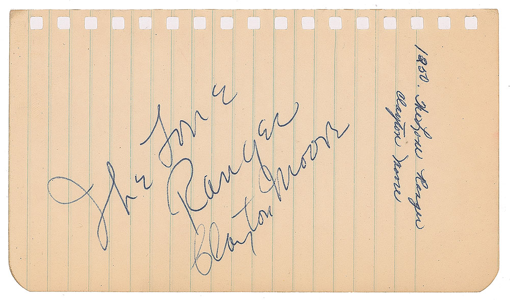 Two items: a ballpoint signature, "The Lone Ranger, Clayton Moore," on an off-white 6 x 3.5 notebook page; and a ballpoint signature and inscription, "To Harvey, Kind regards, Jay Silverheels, Tonto," on an off-white 6 x 3.5 notebook page. In overall fine condition. From the Harvey and Rhoda Kuflik Collection.