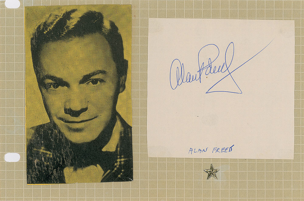 American disc jockey (1921-1965) best remembered for promoting the mix of blues, country, and rhythm and blues music under the name of rock and roll. Sought-after ballpoint signature, "Alan Freed,” on an off-white 4 x 3.75 sheet affixed to a slightly larger sheet bearing a clipped image of the disc jockey. In fine condition. From the Harvey and Rhoda Kuflik Collection.