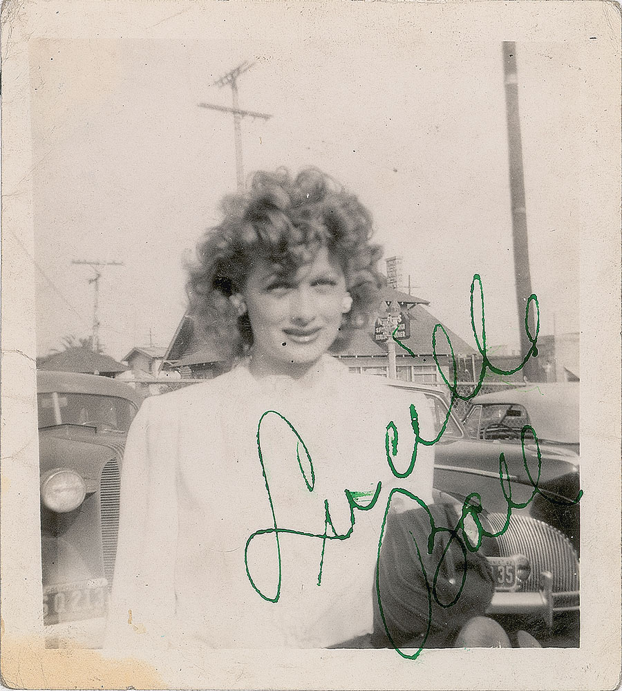 Two items: a vintage glossy 3 x 3.5 candid photo of Lucy wearing a light-colored dress, signed in green fountain pen, "Lucille Ball"; and a purple ink signature, "Suzan Ball Long," on an off-white 5 x 3 notebook page. In overall fine condition, with light staining and scuffing to the Lucy candid. From the Harvey and Rhoda Kuflik Collection.