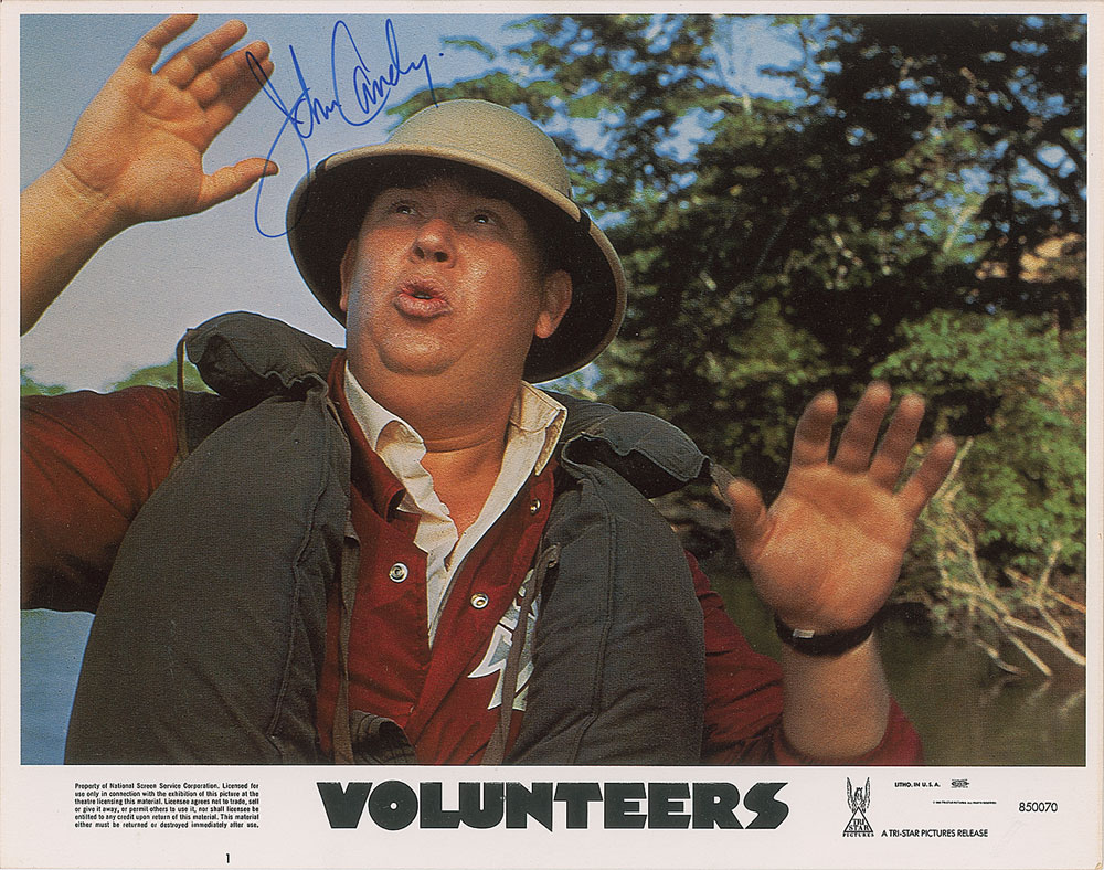 Color Tri-Star Pictures lobby card for the 1985 film Volunteers, 14 x 11, signed in blue felt tip by Candy. In fine condition. From the Harvey and Rhoda Kuflik Collection.