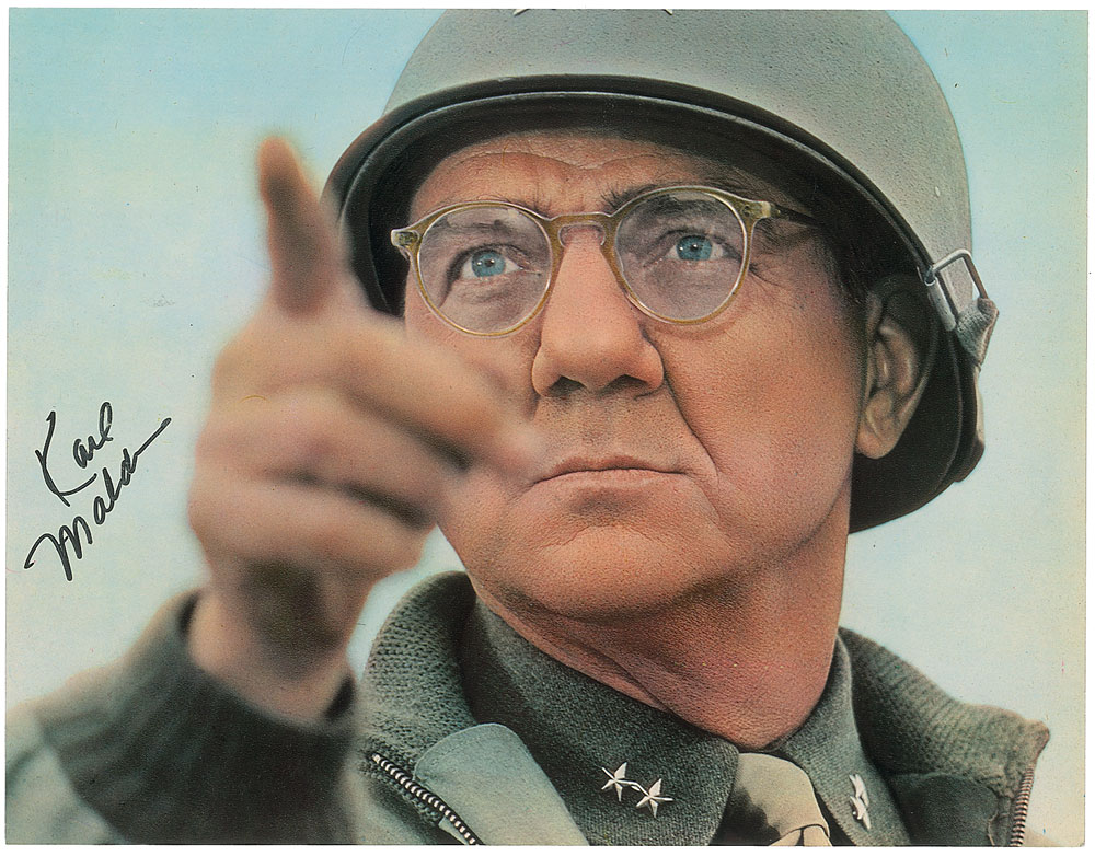 Two items: a color glossy 20th Century Fox Italian movie card for the 1970 film Patton, 14 x 10.75, signed in black felt tip; and a color Paramount Pictures lobby card for the 1961 film One-Eyed Jacks, 14 x 11, signed in black felt tip. In overall fine condition. From the Harvey and Rhoda Kuflik Collection.