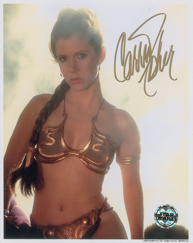 Color satin-finish 8 x 10 photo of Fisher in her classic 'Slave Leia' costume from Star Wars, signed in gold ink. In very fine condition.