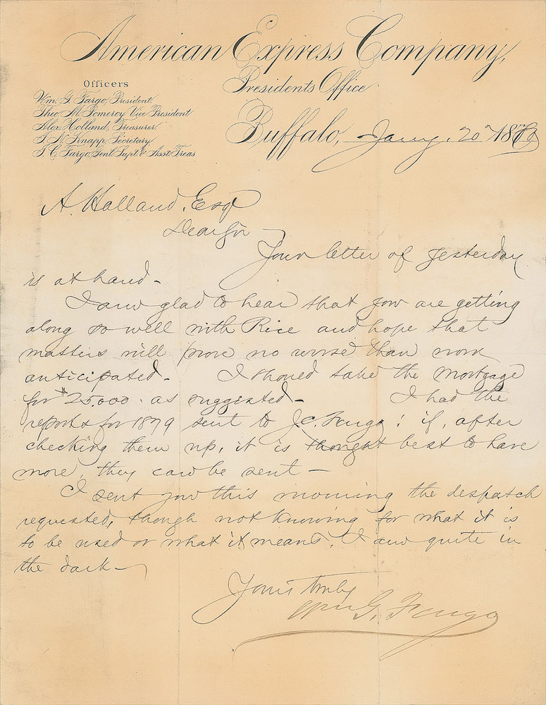 Businessman (1818-1881) who co-founded the famous express firm Wells, Fargo & Co., served as president of American Express, and later directed the New York Central and Northern Pacific Railways. Extremely rare ALS signed “Wm. G. Fargo,” one page, 7.75 x 10, American Express Company letterhead, January 20, 1880. Letter to American Express Treasurer Alex Holland, in part: "I am glad to hear that you are getting along so well with Rice and hope that matters will prove no worse than were anticipated. I should take the mortgage for $25,000 as suggested. I had the report & for 1879 sent to J. C. Fargo: if, after checking them up, it is thought best to have more, they can be sent. I sent you this morning the dispatch requested, though not knowing for what it is to be asked or what it means. I am quite in the dark." In fine condition, with strips of toning to the top and bottom. While Fargo-signed stock certificates are common, letters are exceedingly scarce—this is the first example we have ever encountered.