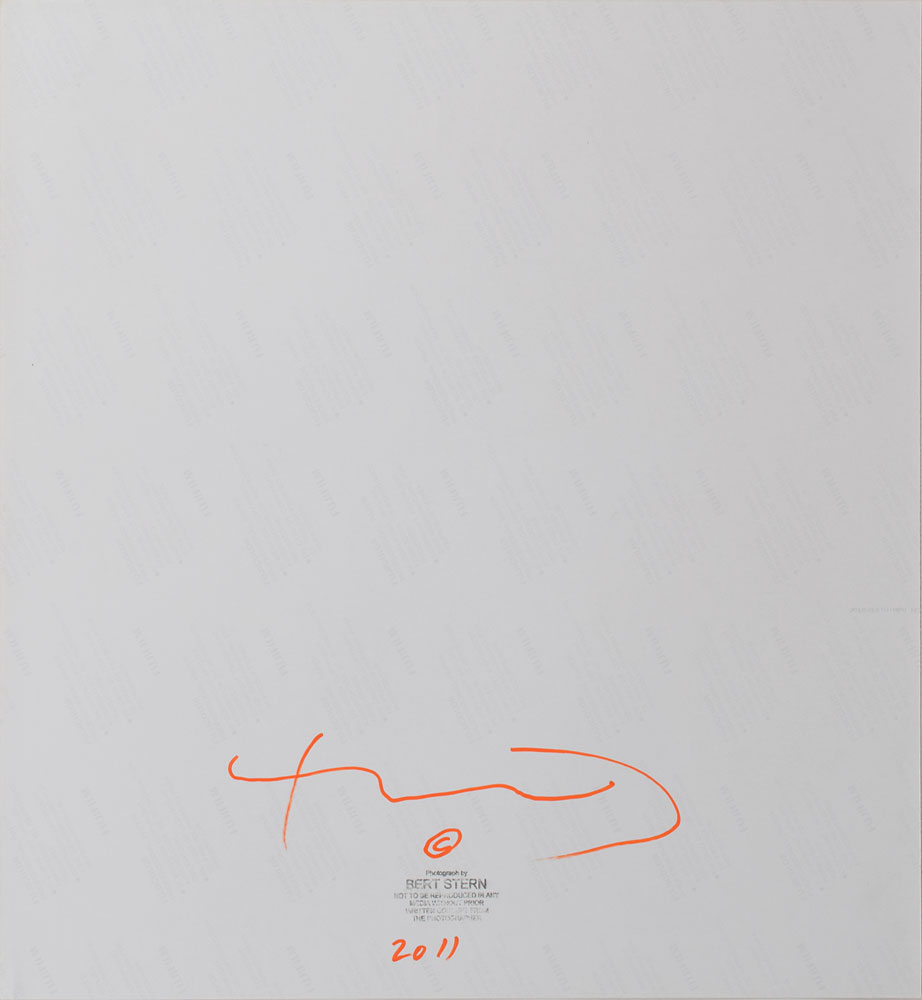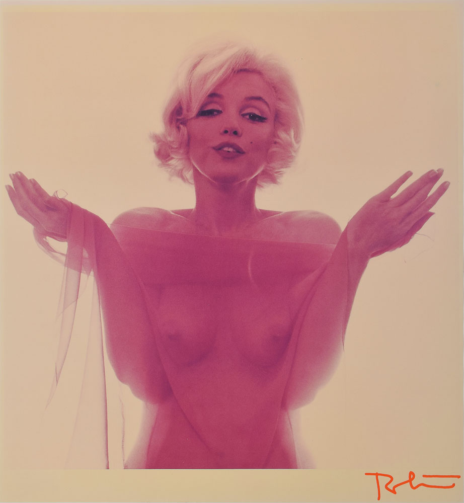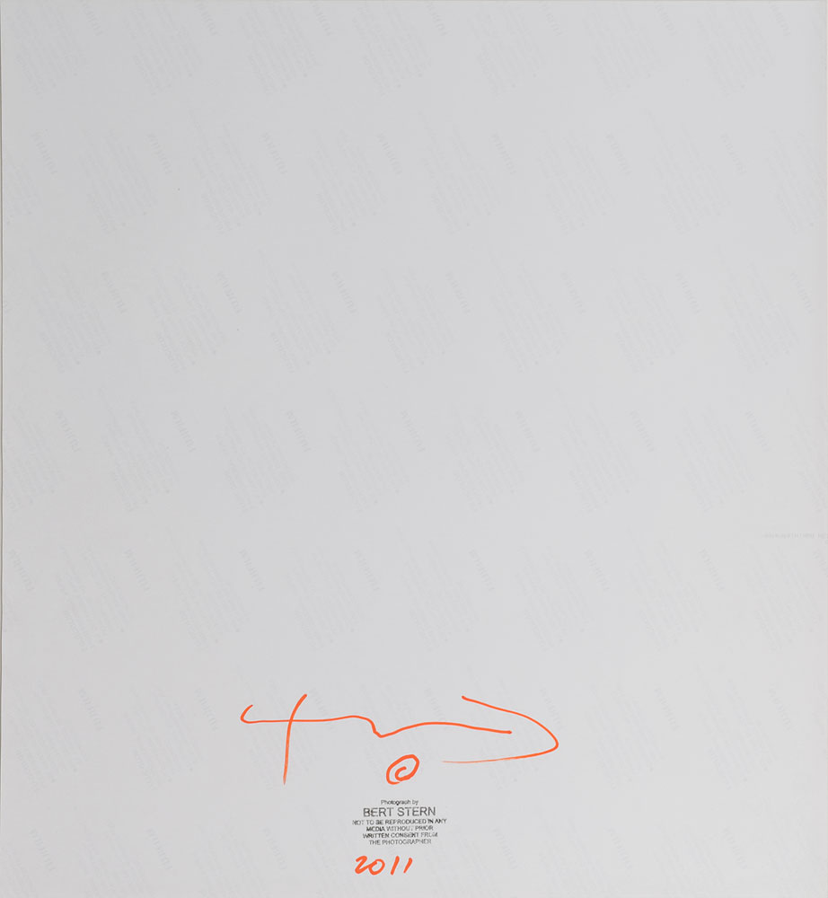 Two high-quality color satin-finish 18.5 x 19.5 photos of Monroe taken by Bert Stern in the iconic 1962 'Last Sitting,' each signed in the lower border in red ink by Stern. Both are stamped on the reverse with Bert Stern copyright stamps and are marked 2011. In overall fine condition.