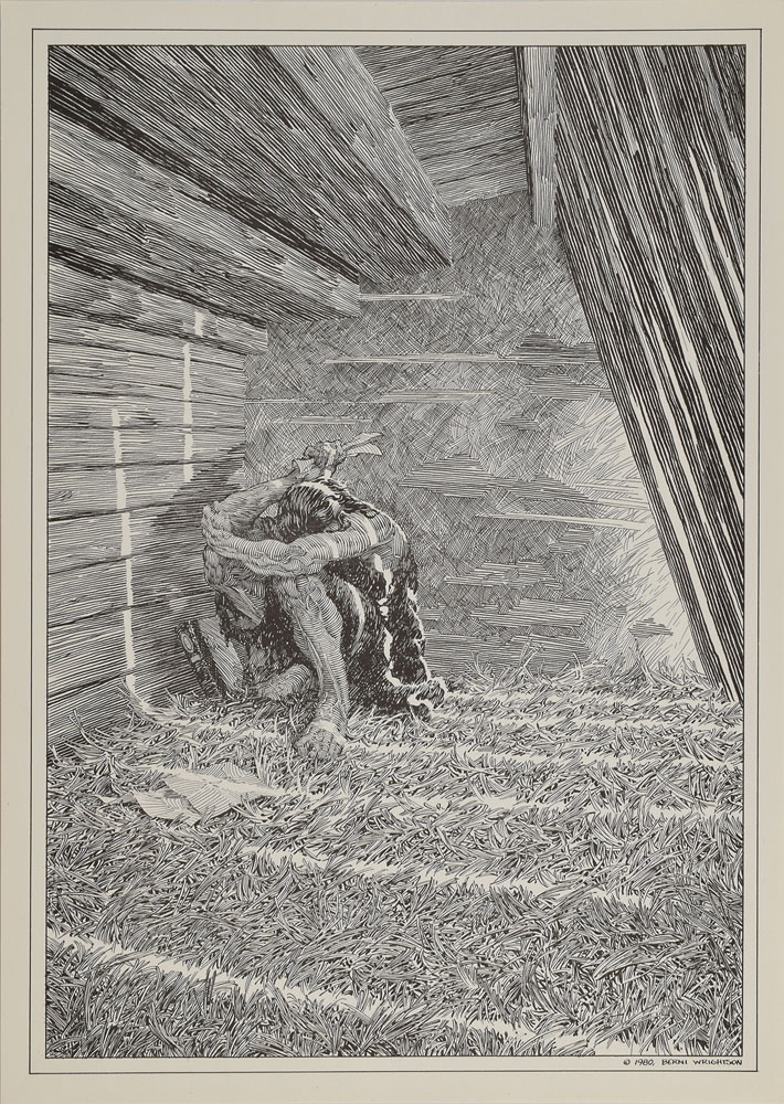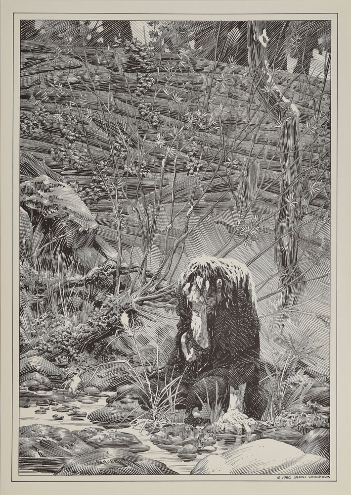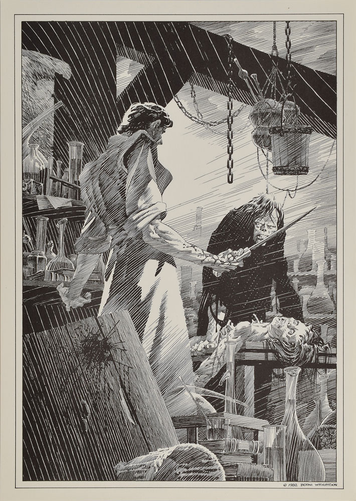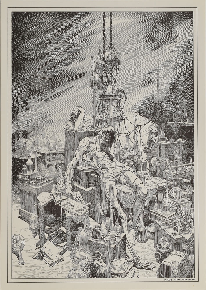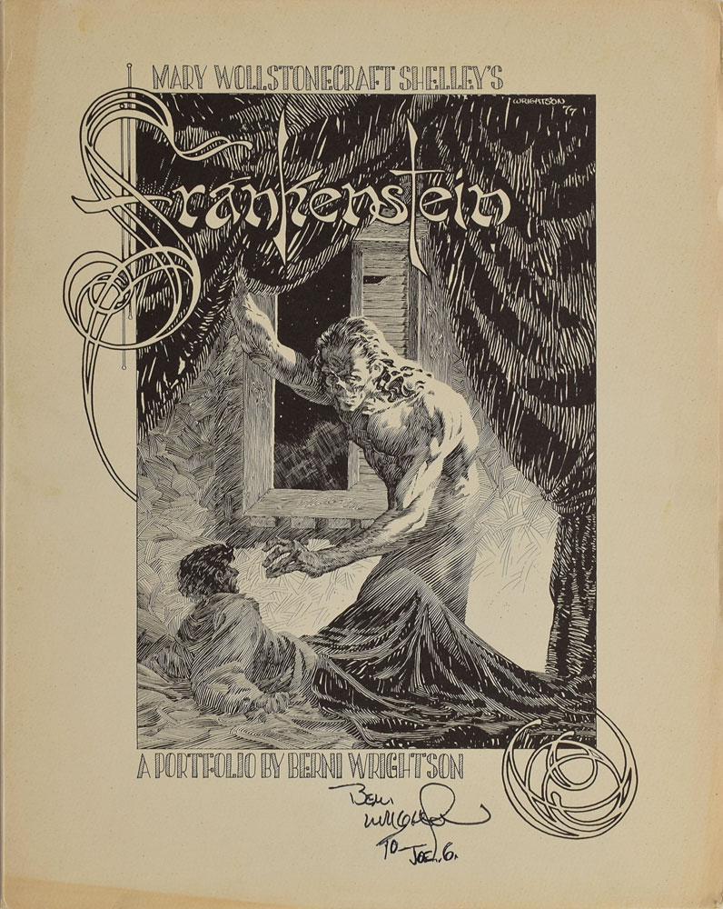 Extremely appealing limited edition portfolio of Bernie Wrightson's illustrations for Mary Wollstonecraft Shelley's Frankenstein, published by Les Editions du Triton in 1980, numbered 175/2000, consisting of six mesmerizing 11.25 x 15.75 prints of Wrightson's artwork for the classic horror novel. Includes the original portfolio folder, which is signed and inscribed on the front cover in black felt tip, "Berni Wrightson, To Joe G." In fine condition, with some light toning to the cover. A DC Comics artist in the seventies and co-creator of fan-favorite Swamp Thing, Wrightson drew 50 pen and ink illustrations to accompany Mary Shelly’s gothic masterpiece Frankenstein between 1976 and 1982. Wrightson originally penned the illustrations for his own amusement, intent on mimicking the engraved style of illustration popular when Shelley’s story first saw print. His private project soon caught wind, however, and in 1983 Marvel Comics published a special edition of Frankenstein incorporating 43 of Wrightson’s beautiful illustrations. But before the Marvel edition was published, a set of three six-plate portfolio collections were released: two by Tyrannosaurus Press and a third by French publisher Les Editions Du Triton. This portfolio—the third—contains illustrations not used in the final book. Learn more about our Animation Expert, Harry Kleiman.