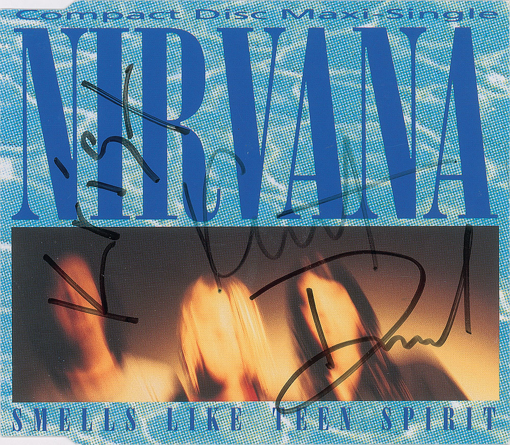 Smells Like Teen Spirit maxi-single CD booklet signed on the front cover in black felt tip, "Kurt," "David," and "Krist." In fine condition. The case and CD are not included. Accompanied by a full letter of authenticity from REAL, which indicates that the signatures were obtained in Houston in the early 1990s.