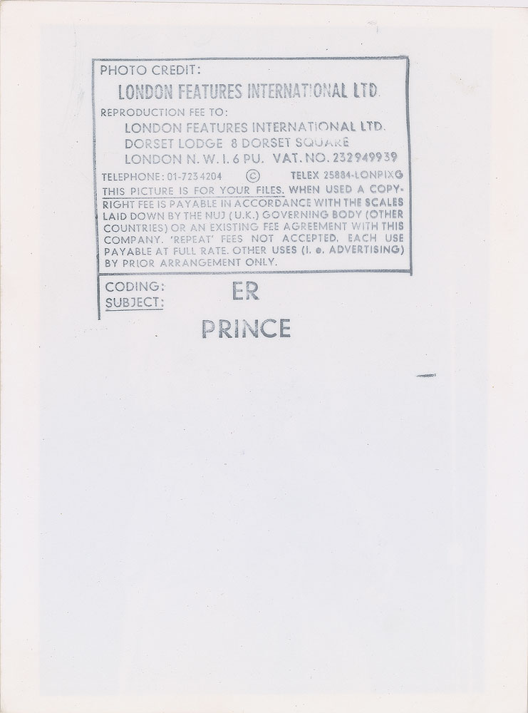 Original vintage glossy 6 x 8 silver gelatin photo of Prince in a wild outfit on stage during his 1981 Dirty Mind Tour. Reverse bears an ER [probably Ebet Roberts]/London Features International credit stamp. In fine condition. From the Globe Photo archives.