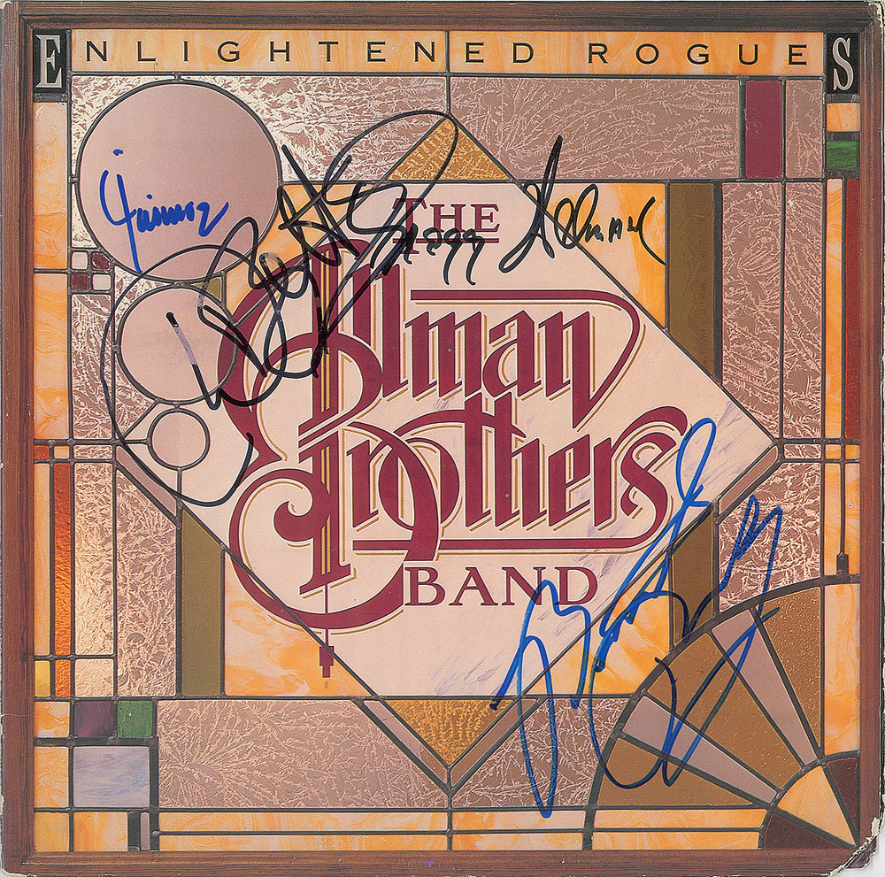 Enlightened Rogues album signed on the front cover in blue felt tip, "Jaimoe" and "Butch Trucks," and in black felt tip, "Dickey Betts" and "Gregg Allman." In fine condition, with a clipped lower right corner tip. The record is included.