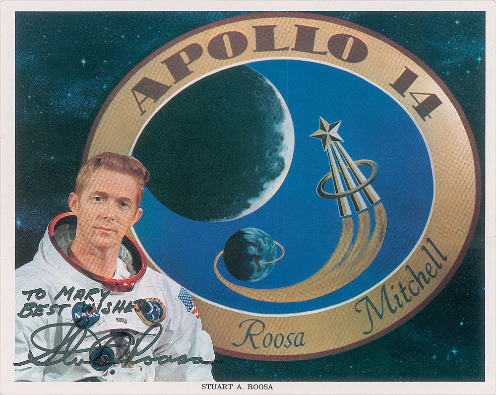 Official color 10 x 8 NASA lithograph of Roosa wearing his white space suit and posing against a large Apollo 14 mission insignia, signed and inscribed in black felt tip, "To Mary, Best wishes, Stu A. Roosa.” In fine condition. From The Bill Lende Collection.