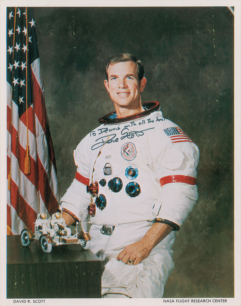 Two photos: an official color 8 x 10 NASA lithograph of Scott posing in his white space suit next to a small model of the lunar rover, signed and inscribed in black felt tip, "To Dennis with all the best, Dave Scott"; and a color semi-glossy 8 x 10 photo of the same pose, signed in blue felt tip. In overall fine condition. From The Bill Lende Collection.