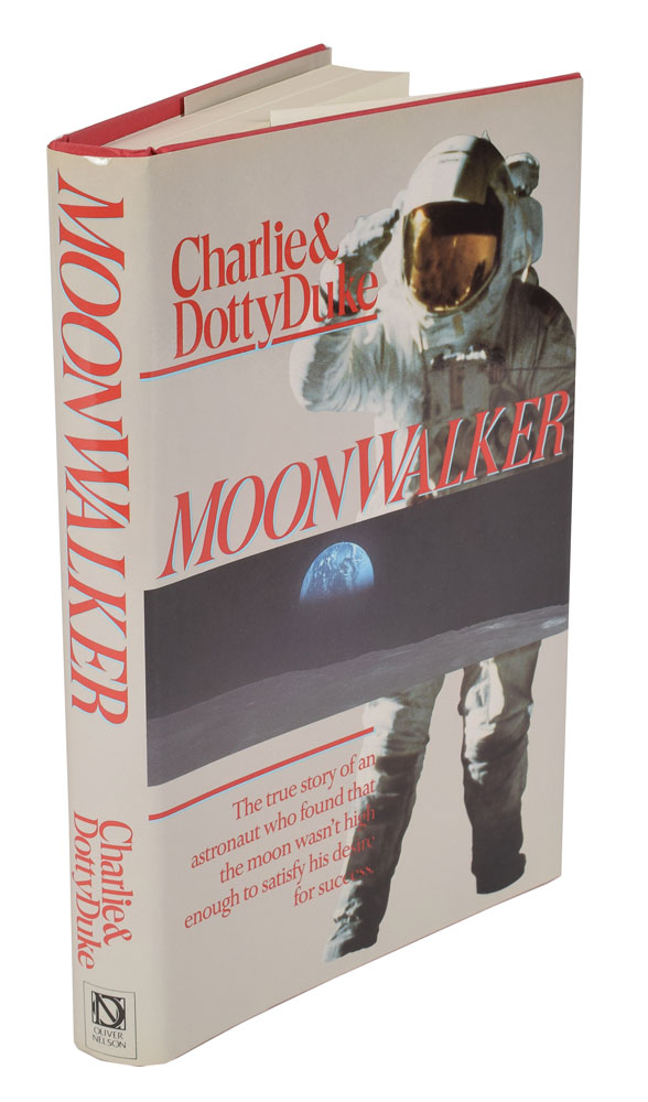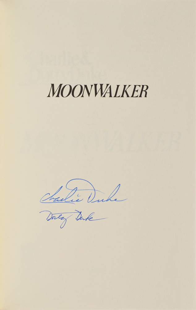 Three items: an official color glossy 8 x 10 red-numbered NASA photo of Duke in his white space suit, signed in black felt tip, "Charlie Duke, Apollo 16"; an official color 10 x 8 NASA lithograph of Duke saluting the American flag on the lunar surface, signed in black felt tip, "Charlie Duke, Apollo 16"; and the book Moonwalker, hardcover with dust jacket, signed on the half-title page in blue felt tip by Charlie Duke and his wife, Dotty Duke. In overall fine condition. From The Bill Lende Collection.
