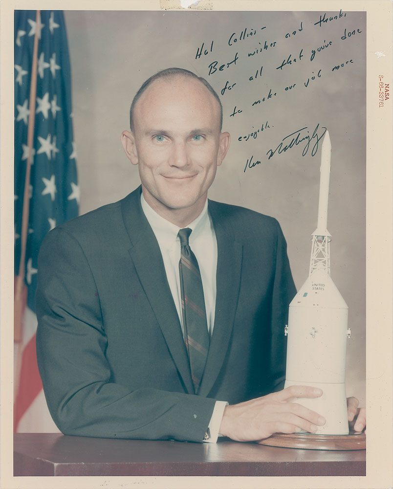 Official color glossy 8 x 10 red-numbered NASA photo of Mattingly posing with a model of a command/service module, signed and inscribed in thin black felt tip, "Hal Collins—Best wishes and thanks for all that you've done to make our job more enjoyable. Ken Mattingly.” Reverse bears "A Kodak Paper" watermarks. In fine condition, with a small bit of adhesive remnant and paper loss to top edge. Before he retired from NASA in 1973, Harold ‘Hal’ Collins proved himself an integral member of the agency’s landmark programs. During the early days of Mercury, he became personally acquainted with the ‘original seven’ as a contracting officer, and then went on to assist any number of moonwalkers during his tenure as chief of mission support for the Apollo program. From The Bill Lende Collection.