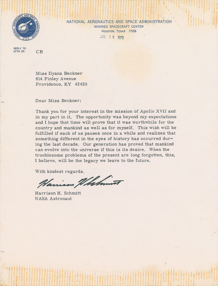 TLS signed “Harrison H. Schmitt,” one page, 8 x 10.5, NASA letterhead, stamp-dated July 16, 1973. Letter to Ilyana Beckner, in full: "Thank you for your interest in the mission of Apollo XVII and in my part in it. The opportunity was beyond my expectations and I hope that time will prove that it was worthwhile for the country and mankind as well as for myself. This wish will be fulfilled if each of us pauses once in a while and realizes that something different in the eyes of history has occurred during the last decade. Our generation has proved that mankind can evolve into the universe if this is its desire. When the troublesome problems of the present are long forgotten, this, I believe, will be the legacy we leave to the future." In very good to fine condition, with toning from previous scrapbook adhesion to top and bottom edges. From The Bill Lende Collection.