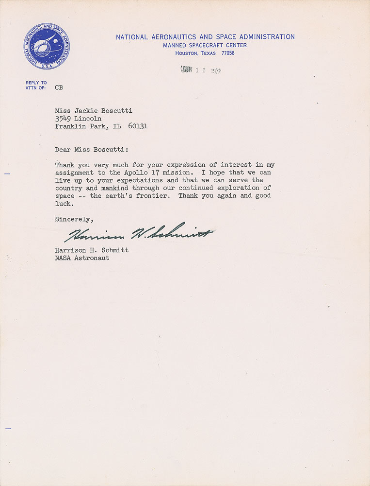 Early TLS signed “Harrison H. Schmitt,” one page, 8 x 10.5, NASA letterhead, June 16, 1972. Letter to Jackie Boscutti, in full: "Thank you very much for your expression of interest in my assignment to the Apollo 17 mission. I hope that we can live up to your expectations and that we can serve the country and mankind through our continued exploration of space—the earth's frontier. Thank you again and good luck." In fine condition. From The Bill Lende Collection.